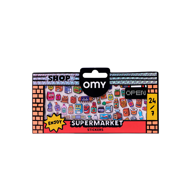 Тележки, полки с товарами, продукты, касса и прочие детали знакомого до боли места — но в весёлом и ярком виде. На листе около 100 стикеров из водостойкого винила с флуоресцентным и голографическим покрытием. Стикеры некрупные, но их действительно много — хватит на тетради, бутылки, телефоны и ещё останется.
