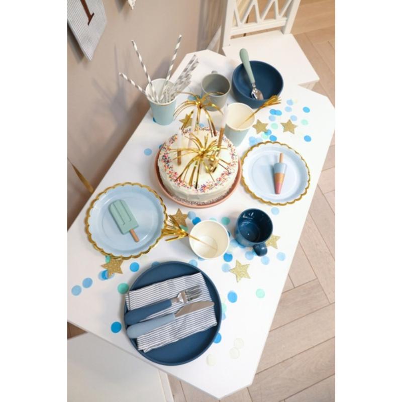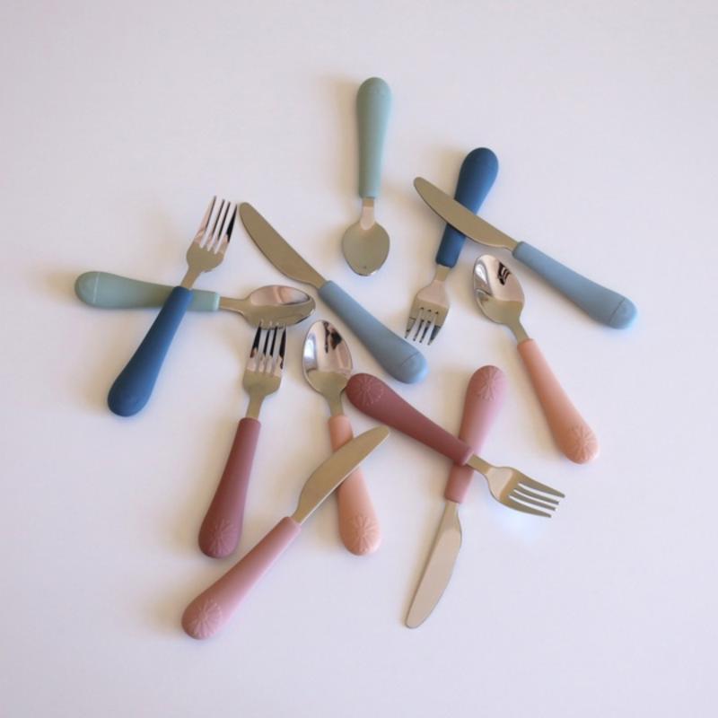 Набор создан для первых самостоятельных приемов пищи, когда малышу важно учиться держать приборы в руке. Форма продумана так, чтобы было удобно брать еду и постепенно развивать уверенность за столом. Легкие элементы подходят для маленьких ладоней и помогают формировать привычку аккуратного питания. Голубой микс оттенков делает процесс еды более спокойным и приятным.