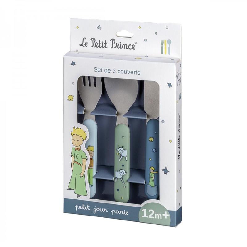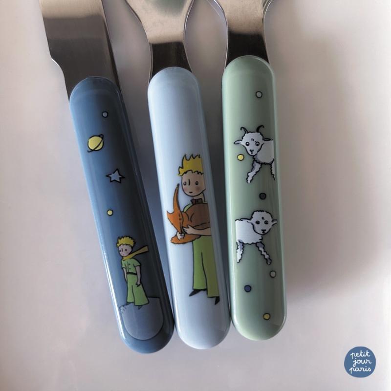 Вилка, ложка и нож с закругленными краями — ребенок учится есть сам. Ручки удобно лежат в руке, не скользят. На приборах иллюстрации из книги о Маленьком принце в голубых тонах. Яркие рисунки персонажей делают прием пищи интереснее для ребенка. Приборы из прочного материала, их можно мыть в посудомойке. Только не ставьте в микроволновку или морозилку. Нож режет мягкую еду, но безопасен для пальцев. Авторские иллюстрации Экзюпери придают особое очарование.