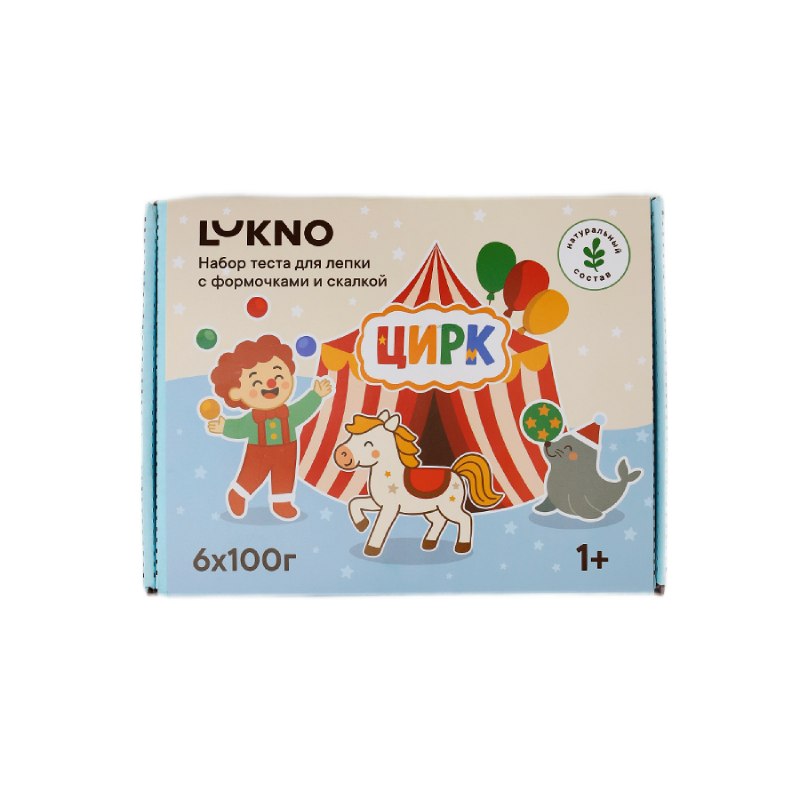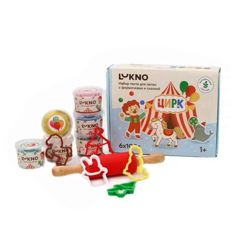 Яркий набор для детского творчества "Цирк" от бренда LUKNO включает безопасное натуральное тесто для лепки в шести баночках разных цветов и с разными ароматами. В комплект входят деревянная скалка и разнообразные формочки: клоун, домик, лошадка и другие цирковые персонажи. Упаковка украшена веселым рыжим клоуном, цирковым шатром и праздничными шариками. Набор предназначен для детей от 1 года, развивает мелкую моторику, воображение и творческие способности. Тесто изготовлено из натуральных компонентов, полностью безопасно для малышей.