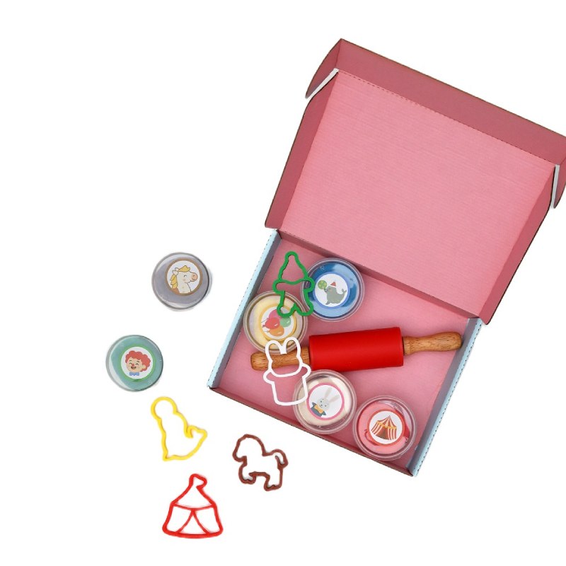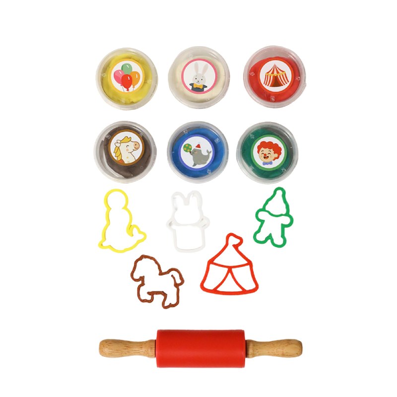 В комплекте: 6 банок нежного теста для лепки оттенки (цвета: коричневый, красный, жёлтый, зелёный, синий, белый), 5 формочек из пищевого пластика, силиконовая скалочка с деревянными ручками.