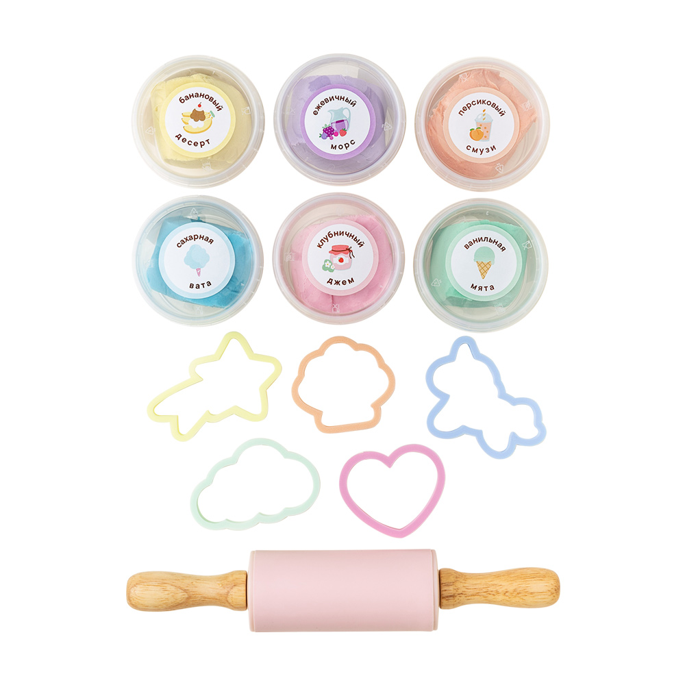 тесто для лепки 6х100г в ассортименте, 5 формочек из пластика, 1 скалка силиконовая с деревянными ручками