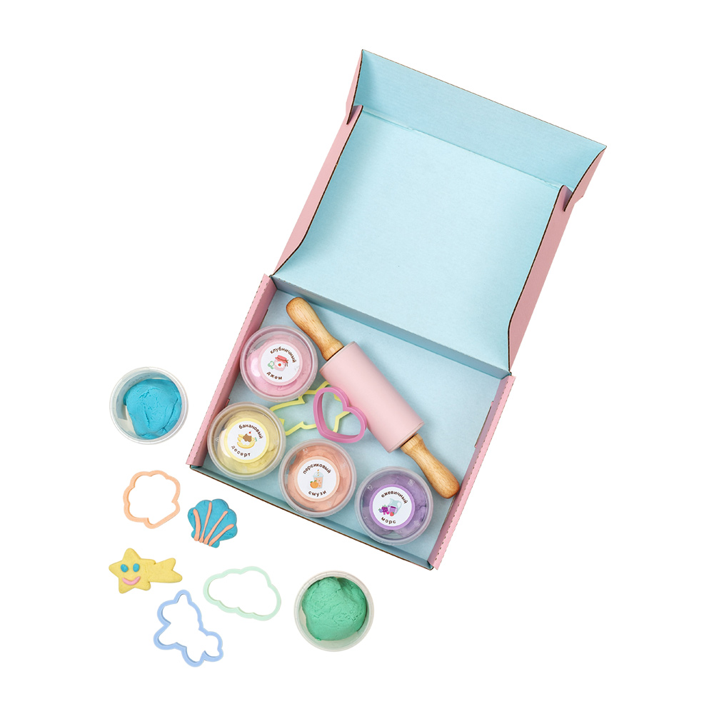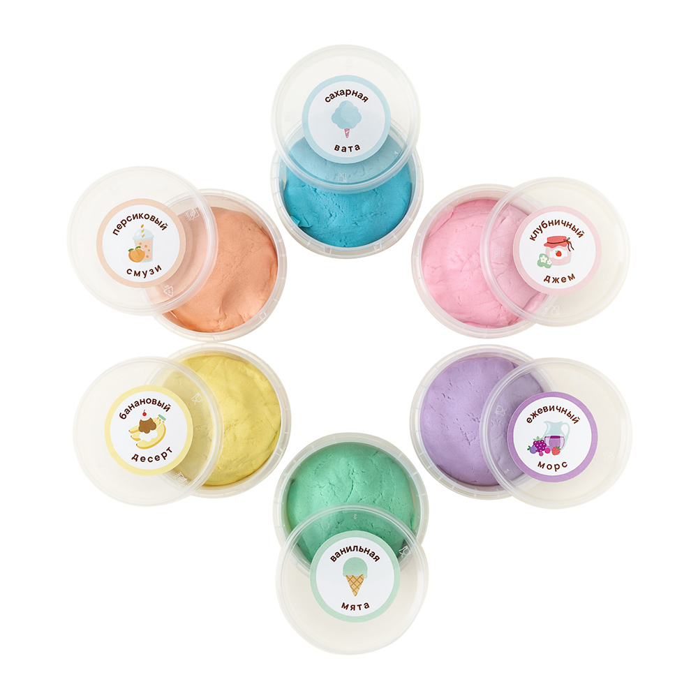 В комплекте: 5 формочек из пищевого пластика, силиконовая скалочка с деревянными ручками и 6 банок нежного теста для лепки. Оттенки/ароматы теста: розовый, "Клубничный джем"; персиковый, "Персиковый смузи"; жёлтый, "Банановый десерт"; бирюзовый, "Ванильная мята"; голубой, "Сахарная вата"; фиолетовый, "Ягодный морс".