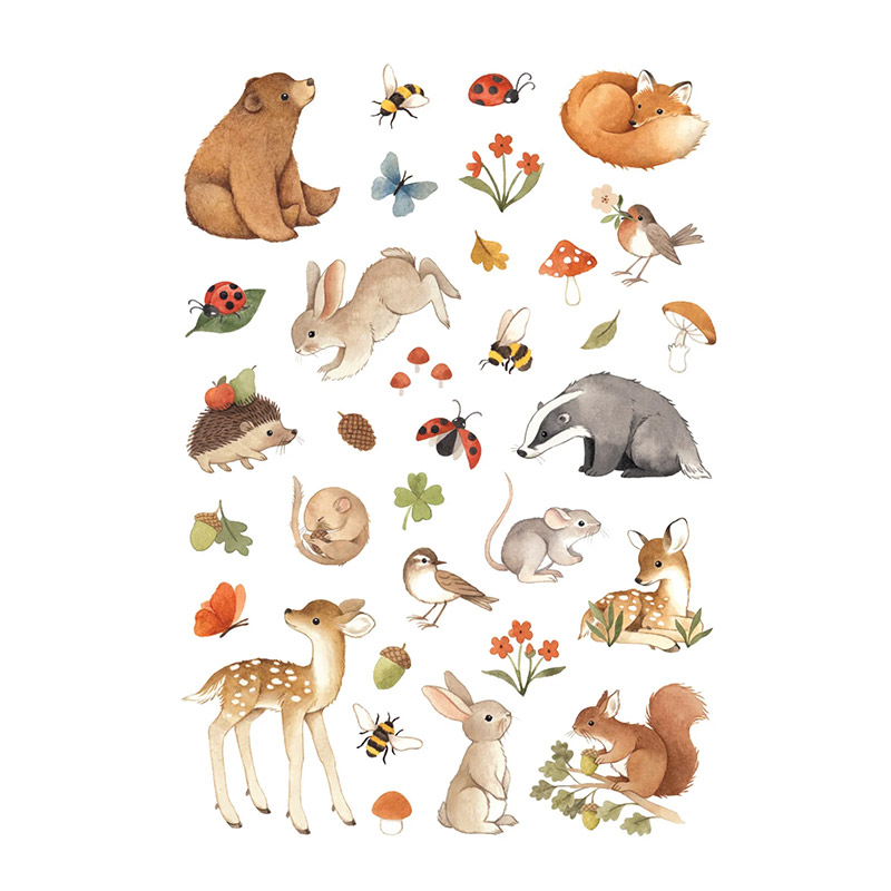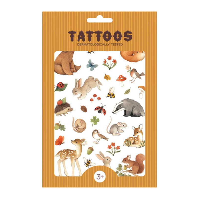 Два листа с 33 татуировками на каждом — лесные звери, растения, грибы в природных оттенках. Наклеиваются на кожу через воду, держатся несколько дней, легко смываются маслом. Дерматологически протестированы, не вызывают раздражения. Упакованы в картонный конверт, который можно повесить. Возраст 3+, иллюстратор — Нина Стайнер.