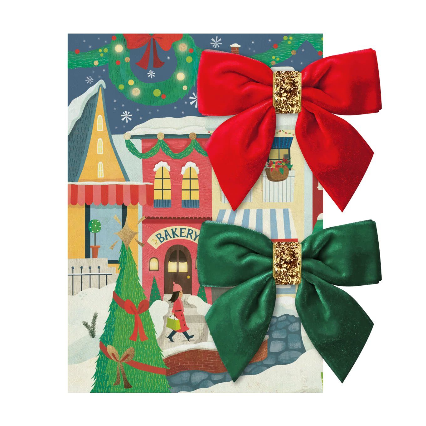 В этот набор входят два бантика, выполненных в стандартных цветах зимних праздников: зелёном, красном и золотом. Красный и зеленый бант с золотыми полосками укреплены на замечательной авторской новогодней открытке и будут хорошим подарком для маленькой модницы. Заколки выполнены из бархатной ленты, натуральный текстиль не содержит вредных веществ, а в металле нет никеля, благодаря чему заколки безвредны даже для самых маленьких.