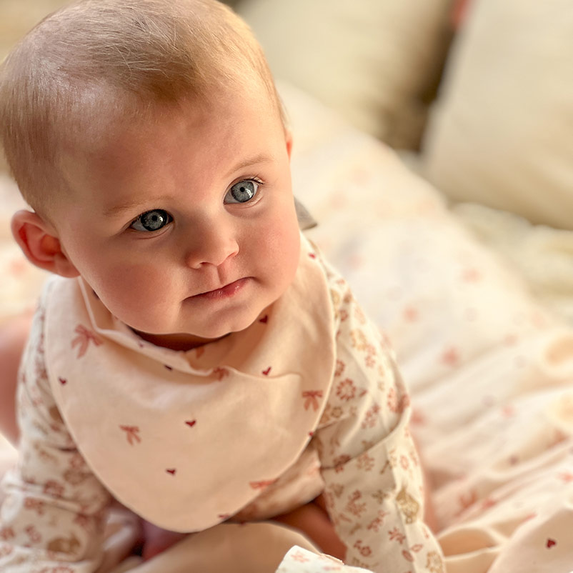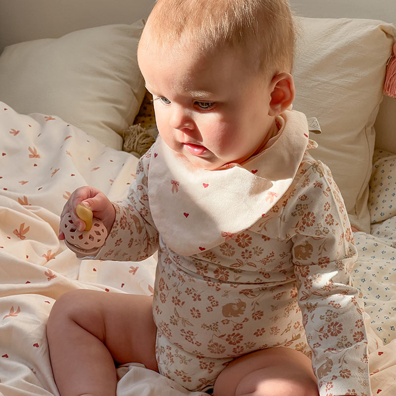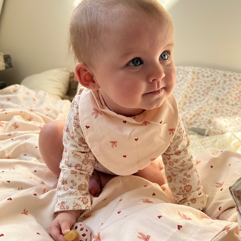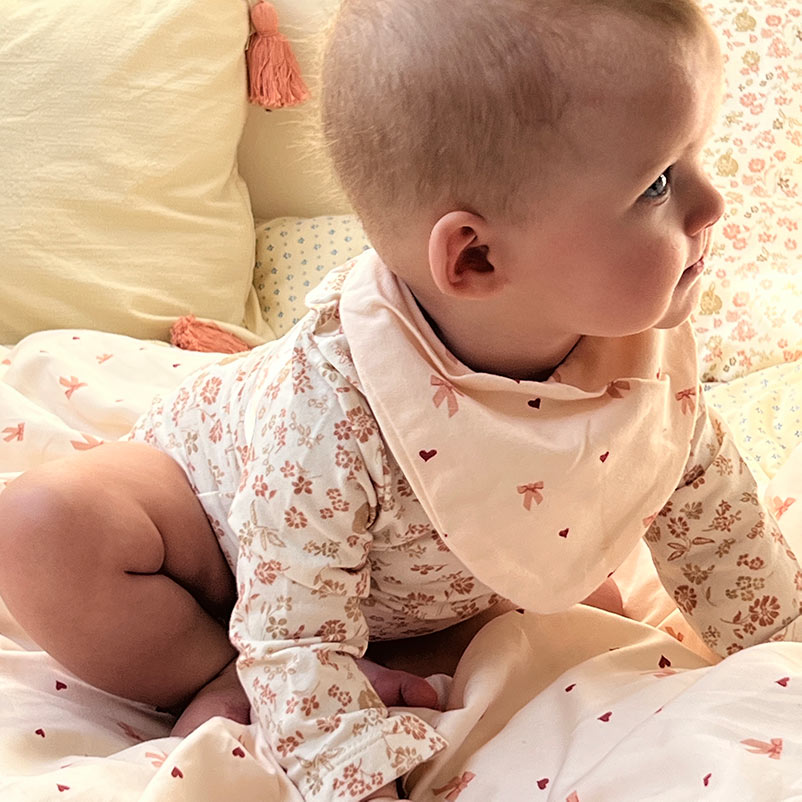 Два нагрудника-банданы из органического хлопка, которые застегиваются на кнопки с двумя положениями — можно выбрать нужный объем под горлышко. Мягкий трикотаж хорошо тянется и не сковывает движения. При желании носится как шарф, так что вещь работает дольше, чем обычный нагрудник. Принт «Бантики» на кремовом — аккуратно и без пестроты.