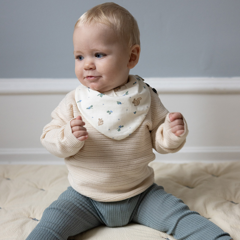 Набор из двух нагрудников-бандан на каждый день — мягкий трикотаж из органического хлопка хорошо впитывает и не раздражает нежную кожу. Две кнопки на шее позволяют отрегулировать посадку. Можно носить как шарф — и тогда вещь пригодится дольше обычного. Принт «Черника» на кремовом фоне выглядит аккуратно в любом сочетании.