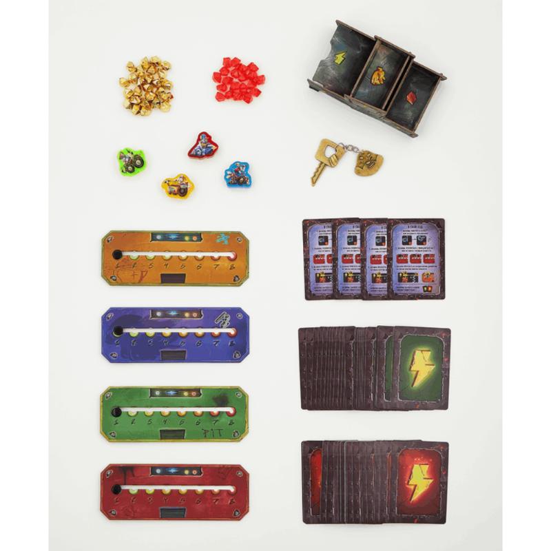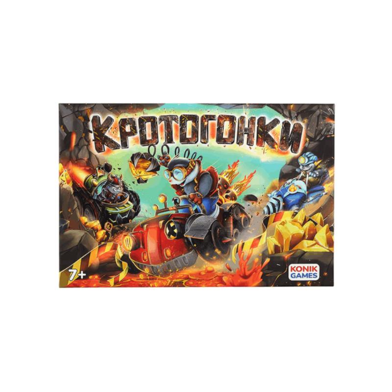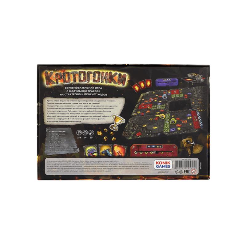 В комплекте: 12 тайлов трассы, 4 кротомобиля, 25 золотых слитков, 60 карт бонусов, 20 кристаллов повреждений, 4 планшета скорости игрока, картонный органайзер, металлический жетон первого игрока, правила игры, ложемент.