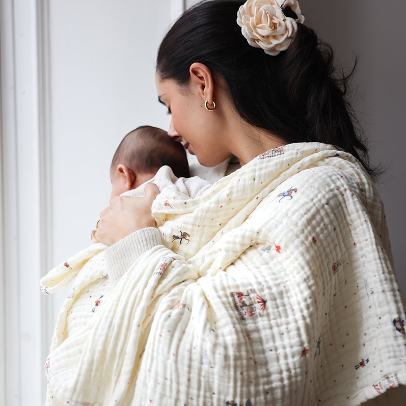 Муслиновое одеяло большого формата с принтом карусели. Лёгкая многослойная ткань создаёт воздушную структуру, которая дышит и регулирует температуру. Кремовый оттенок универсален, вписывается в любой интерьер. Одеяло можно использовать в кроватке, коляске или как покрывало для игр на полу. Муслин становится мягче с каждой стиркой. Органический хлопок безопасен для малыша. Увеличенный размер делает одеяло универсальным для разных ситуаций.