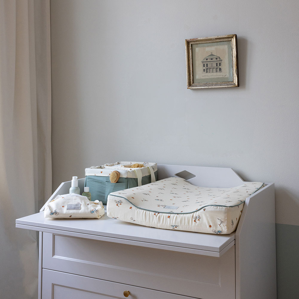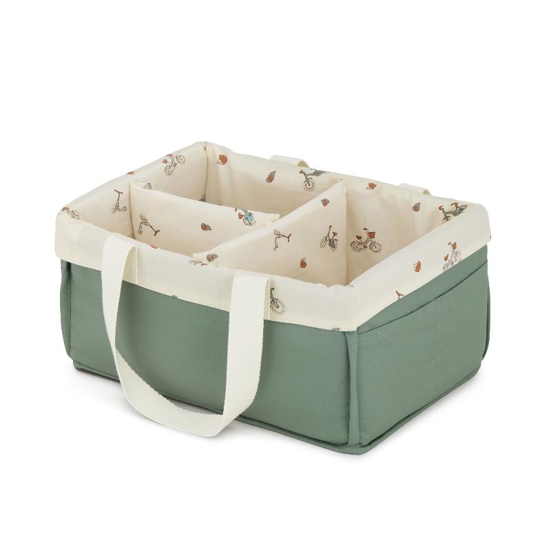 Порядок и стиль в одном предмете! Практичный текстильный кэдди с принтом велосипедов навел порядок на пеленальном столике! Три отделения и внешние карманы вмещают подгузники, салфетки, кремы и всё необходимое. Боковые ручки позволяют легко переносить органайзер по дому или брать в поездку. Лёгкий, но вместительный, сшит из органического хлопка.