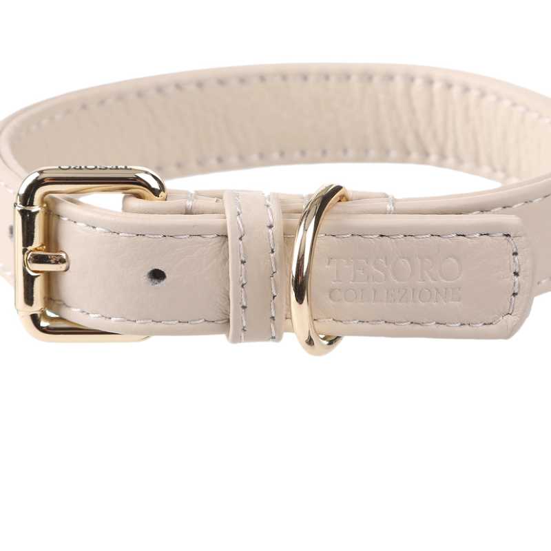 Ошейник Tesoro нежно-бежевого цвета выглядит очень стильно. Он подойдет для прогулок и выставок, не будет натирать вашему питомцу и обеспечит ему максимальный комфорт. Ошейник выполнен из натуральной кожи высокого качества, поэтому он гибкий, мягкий, прочный и долговечный. В качестве застежки используется металлическая пряжка, а значит вы можете регулировать аксессуар по длине.