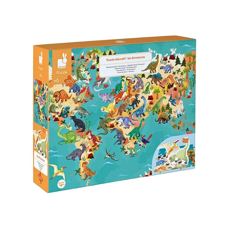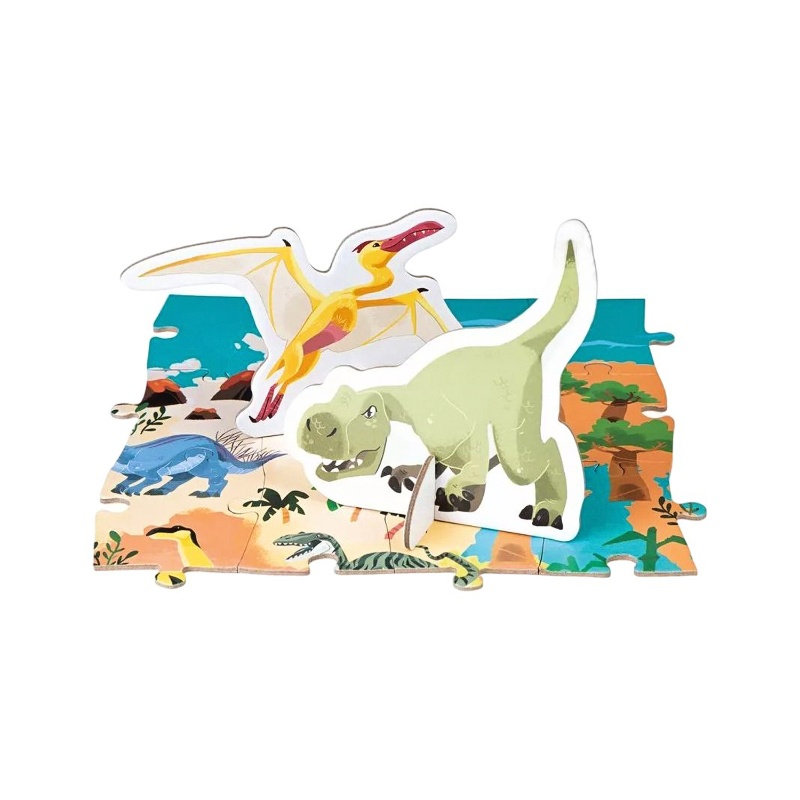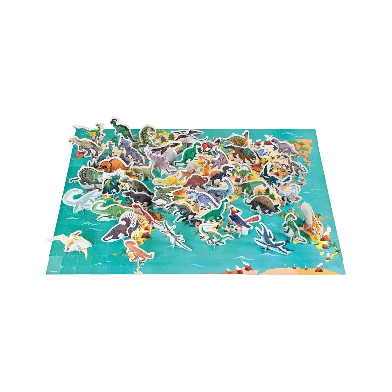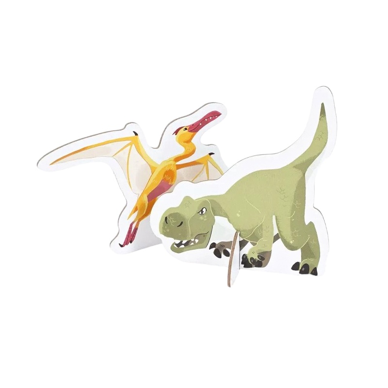 Объёмный картонный пазл из 200 фрагментов открывает детям мир динозавров. Сначала собирается плоская сцена, затем добавляем объём — 50 фигурок динозавров на подставках. На обратной стороне фигур есть их названия на английском. После сборки получается большая панорама, развивающая внимание и воображение.