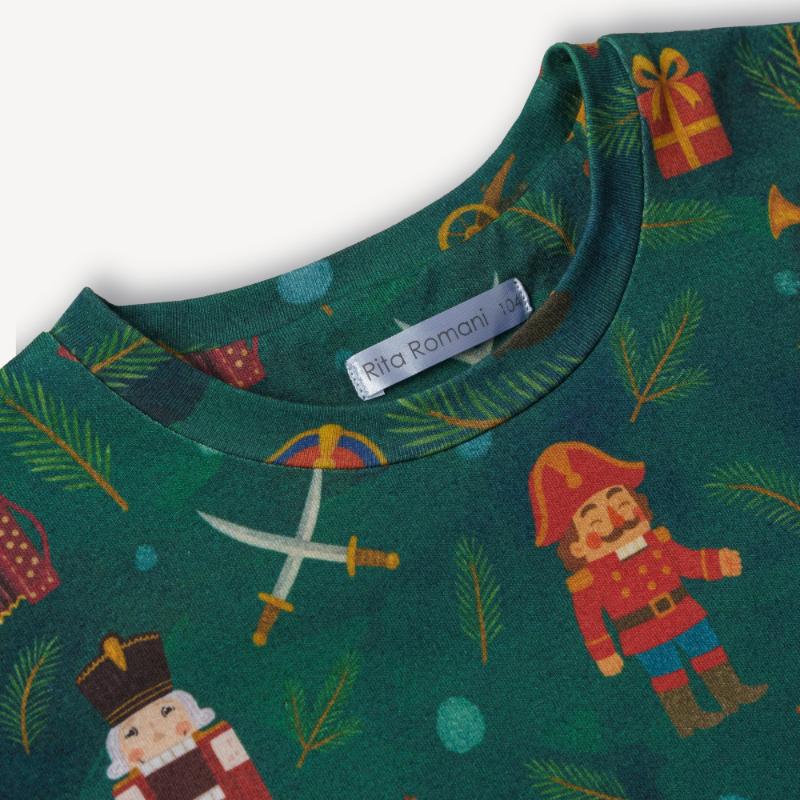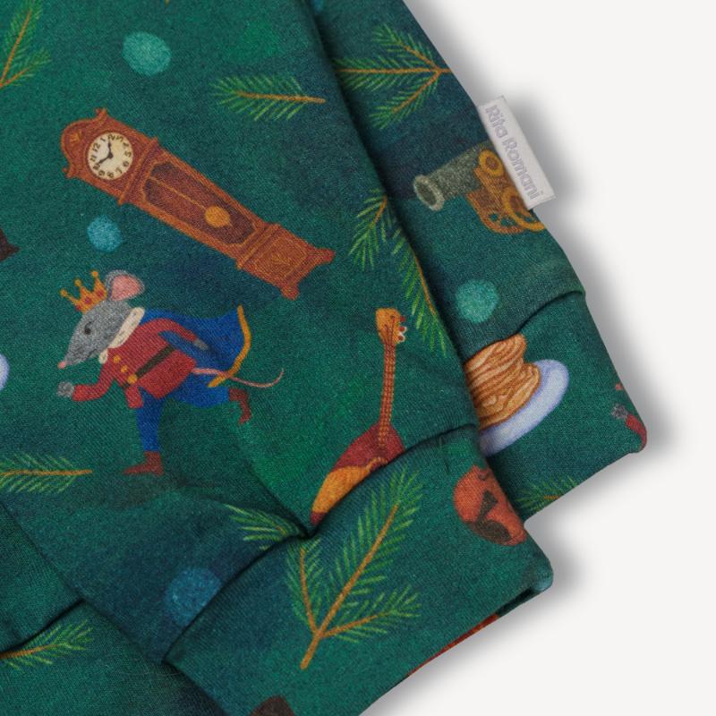 Темно-зеленый свитшот украшен яркими рисунками: новогодние игрушки и сказочные персонажи. Однотонные брюки того же оттенка дополняют образ и делают комплект универсальным. Натуральный хлопок с добавлением эластана мягкий и эластичный, позволяет коже дышать. Анатомичный крой обеспечивает комфортную посадку, манжеты аккуратно облегают запястья и щиколотки. Краски стойкие, не выцветают после стирок. Пижама, в которой хочется проводить все выходные дома.