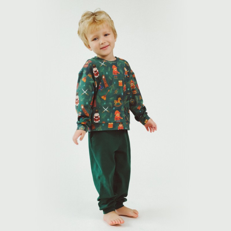 Темно-зеленый свитшот украшен яркими рисунками: новогодние игрушки и сказочные персонажи. Однотонные брюки того же оттенка дополняют образ и делают комплект универсальным. Натуральный хлопок с добавлением эластана мягкий и эластичный, позволяет коже дышать. Анатомичный крой обеспечивает комфортную посадку, манжеты аккуратно облегают запястья и щиколотки. Краски стойкие, не выцветают после стирок. Пижама, в которой хочется проводить все выходные дома.