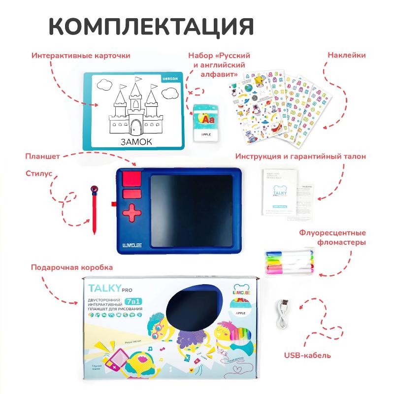 Дополнительная информация: в комплекте: устройство Talky Pro, комплект карточек 61 шт. с алфавитом на русском и английском языках, флуоресцентные фломастеры 5 шт., комплект интерактивных двусторонних карточек 10 шт., наклейки, кабель для зарядки USB Type-C, инструкция, гарантийный талон.