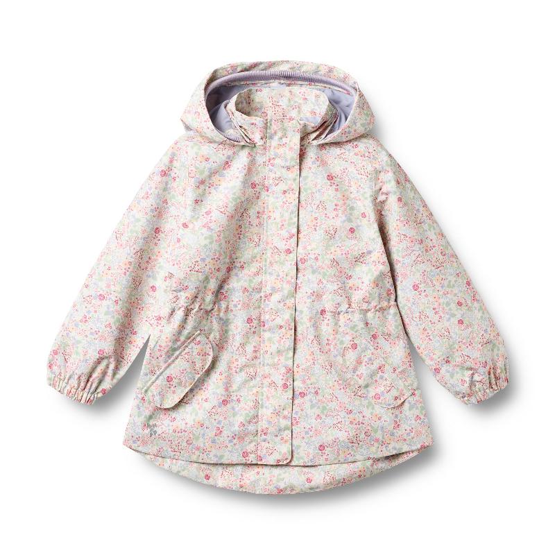 Легкий плащ А-силуэта с цветочным принтом из водонепроницаемой дышащей ткани. Съемный капюшон с регулировкой, скрытая молния под планкой с кнопками, резинки на манжетах и талии. Карманы с клапанами на кнопках, спинка удлиненная. Грязеотталкивающий материал легко чистится влажной тряпкой. Хорош для переменчивой весенней погоды — не промокает под дождем, но и не парит в солнечный день.