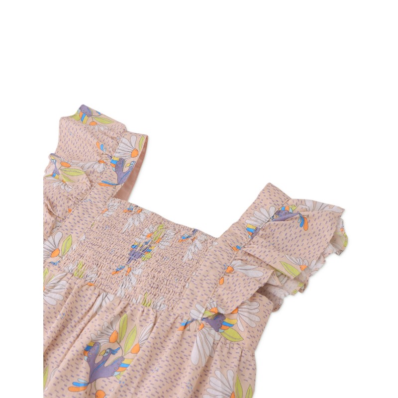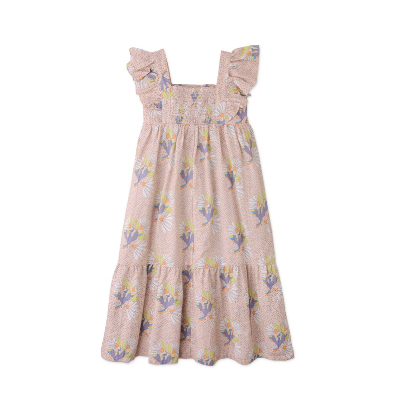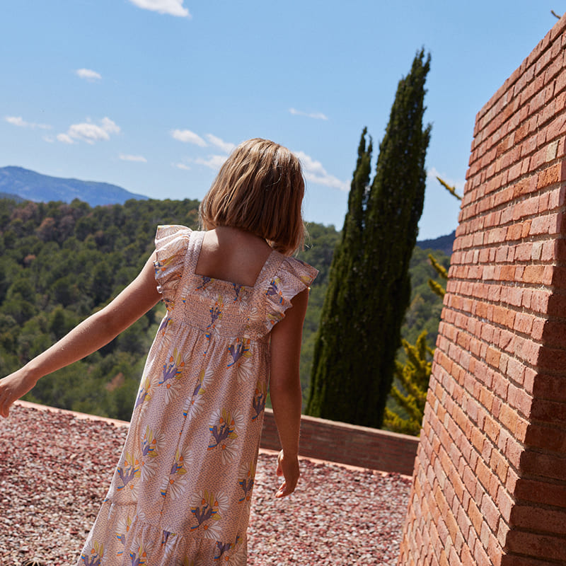 Длинное, романтичное и воздушное платье — как воплощение лета, цветов и отдыха. Рукава-крылышки и небольшая присборенная планка хорошо подчёркивают свободный силуэт. Несколько ярусов юбки создают эффект струящейся ткани. Платье не стесняет движений, а нежные оттенки обязательно понравятся вашей девочке.