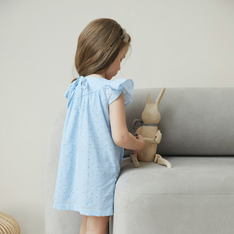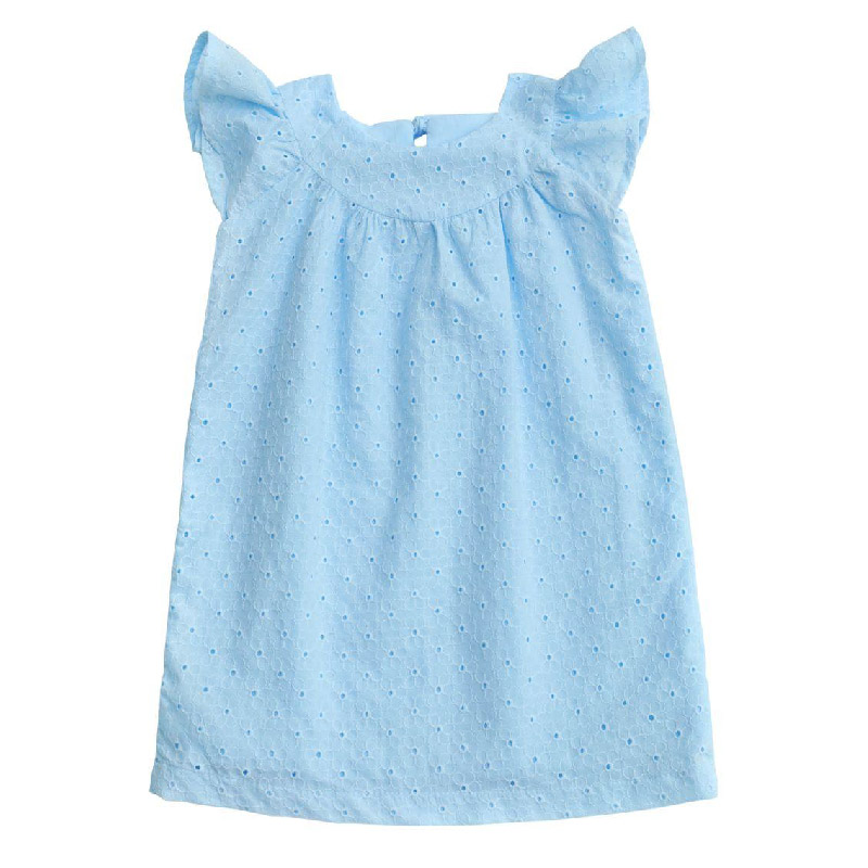 Воздушное голубое платье из ткани с шитьём украшено трогательными крылышками на кокетке, создавая лёгкий и романтичный образ. Мягкий и качественный материал приятен на ощупь и не ограничивает движений, что важно для активных детей. Модель подходит для особых случаев и летних прогулок, отлично комбинируется с лёгкой обувью и аксессуарами. Светлый оттенок и изящные детали делают платье универсальным и нежным.