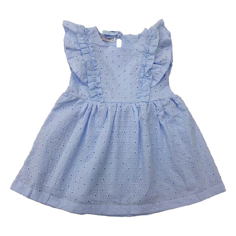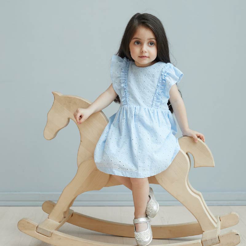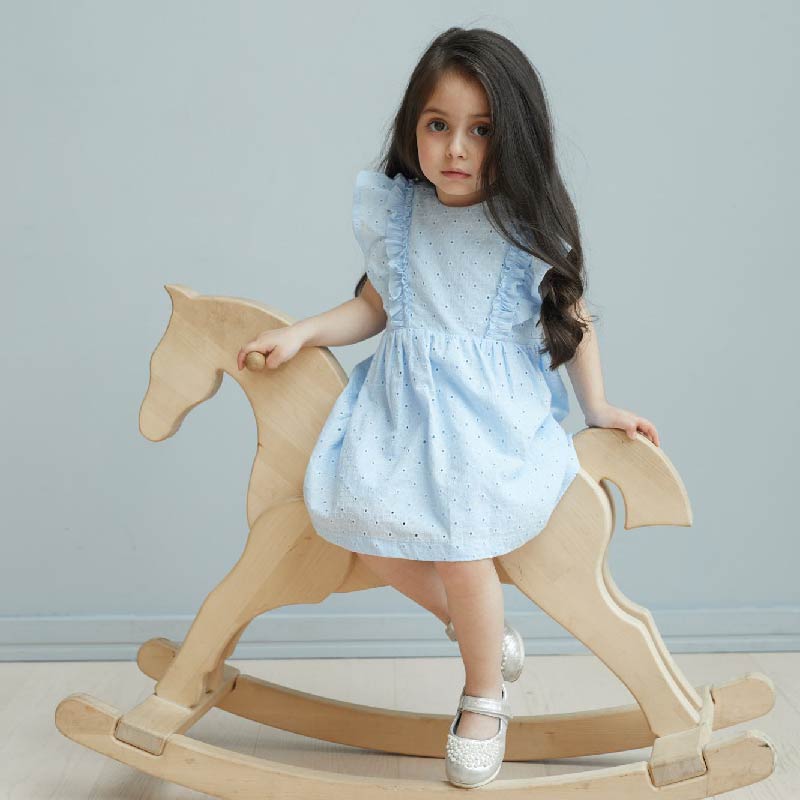 Это изящное платье выполнено из нежной ткани с изысканным шитьём, дополненным декоративными крылышками на кокетке. Голубой цвет придаёт образу легкость и воздушность, делая его отличным выбором для тёплых дней и праздничных мероприятий. Мягкий и дышащий материал комфортен для активных игр и прогулок, а продуманный крой обеспечивает свободу движений. Такой наряд подчеркнёт детскую нежность и станет стильным элементом гардероба.