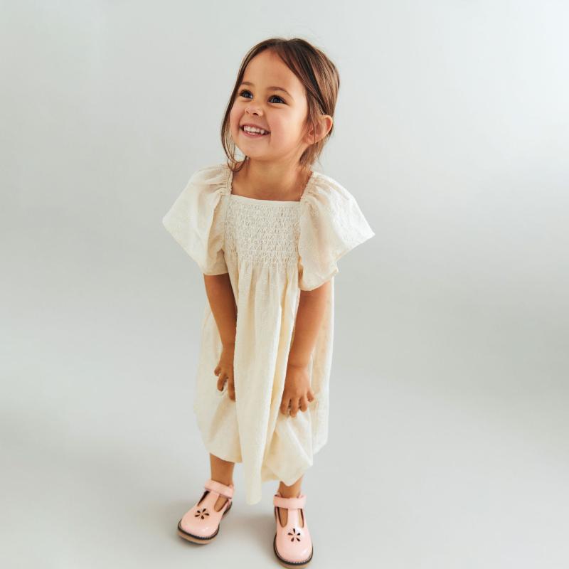 Платье из органического хлопка с кружевным воротником. Свободный крой, широкий короткий рукав, длина выше колена. Сборки ниже талии придают объем юбке. Застежка-пуговицы на спине, верхняя часть на подкладке. Комфортное для жарких дней, не сковывает движений. Носится с сандалиями летом или с леггинсами и кардиганом в прохладную погоду. Нежный цвет подходит для торжественных случаев и повседневной носки.
