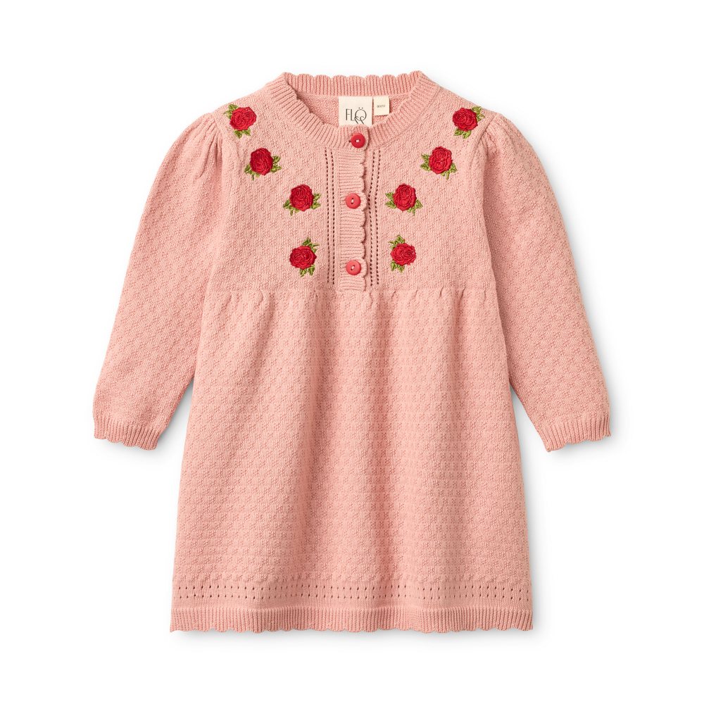 Вязаное платье с узором из бутонов. Вязка эластичная, не сковывает движений. Органический хлопок мягкий, швы плоские. Тёплый розовый цвет с алыми бутонами создаёт романтичный образ. Платье можно носить с колготками в прохладную погоду. Подходит для прогулок, игр и торжественных случаев. Легко надевается через голову, не мнётся.