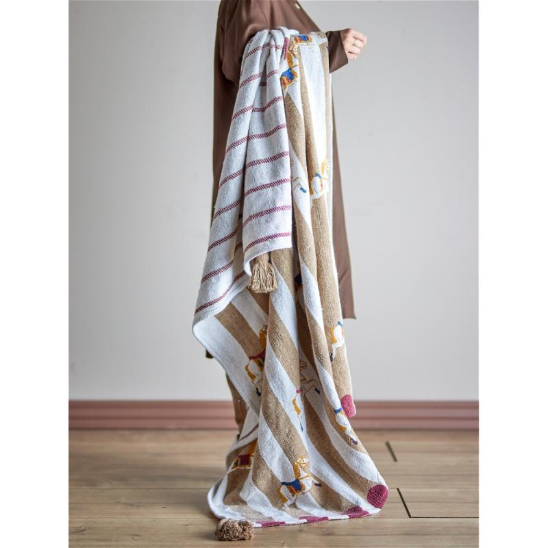 Плед выполнен в спокойном бежевом тоне и украшен мягким узором, который добавляет текстуре глубину. Размер 160×130 см позволяет использовать его как декоративный элемент на кровати или диване. Он создаёт ощущение завершённости интерьера и помогает привнести в пространство немного уюта без лишнего акцента.