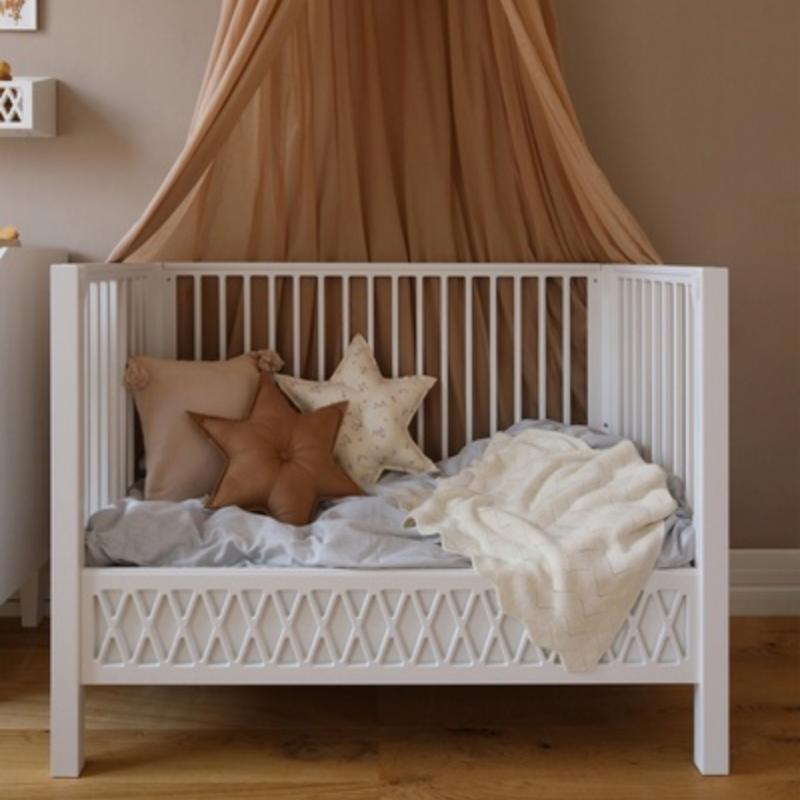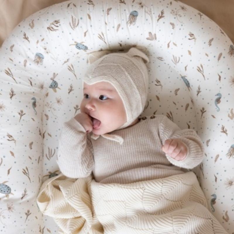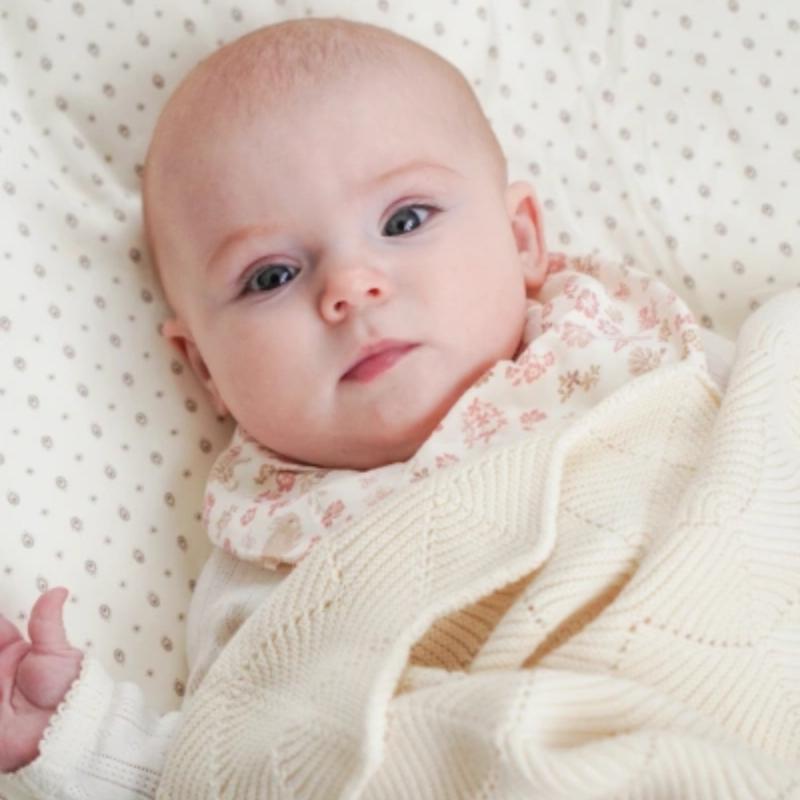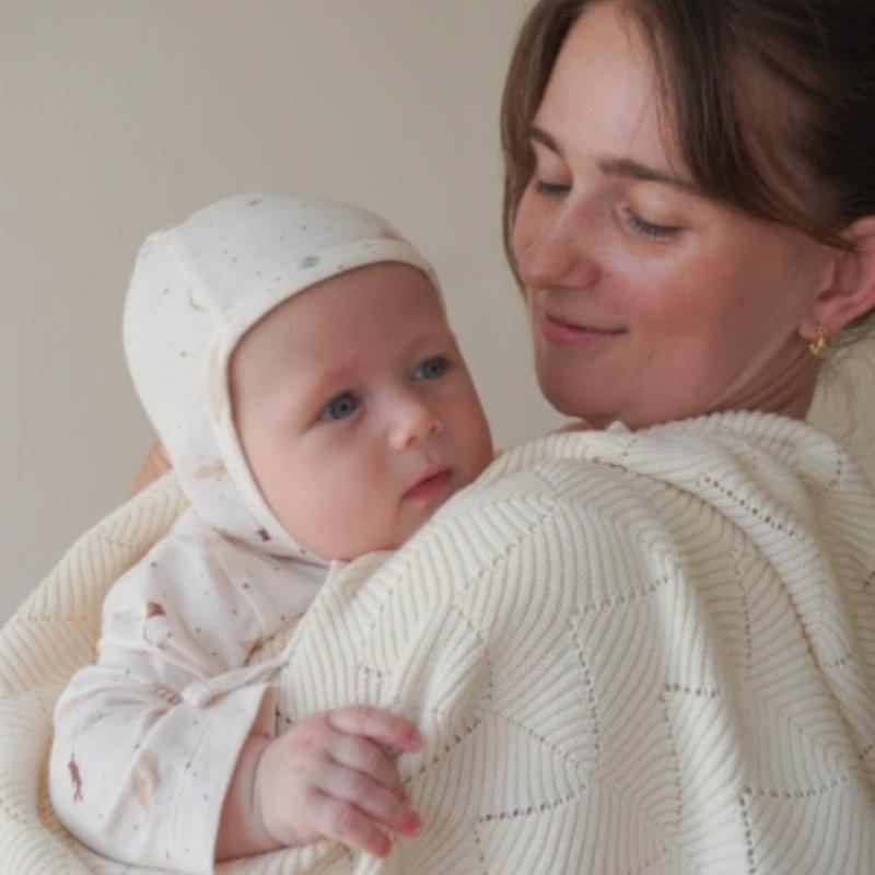 Мягкий вязаный плед создан для первых дней малыша, когда особенно важны тепло и спокойствие. Он подходит для укрывания во время сна, прогулок в коляске или отдыха на руках у родителей. Плотная, но воздушная вязка помогает сохранять комфортную температуру. Кремовый оттенок выглядит нейтрально и легко вписывается в любой детский интерьер, создавая ощущение уюта и спокойствия.