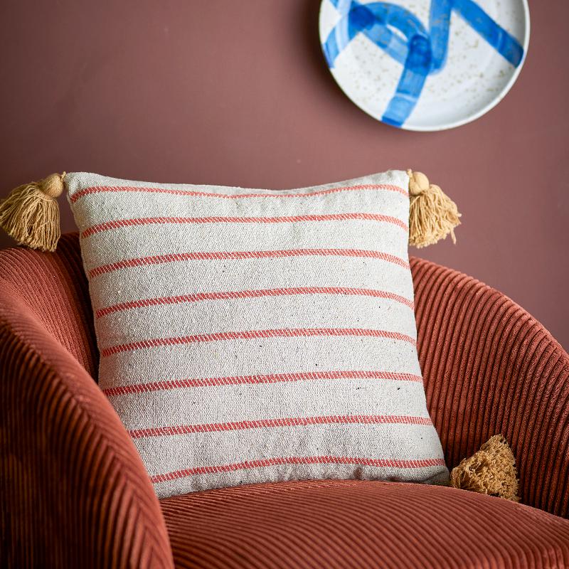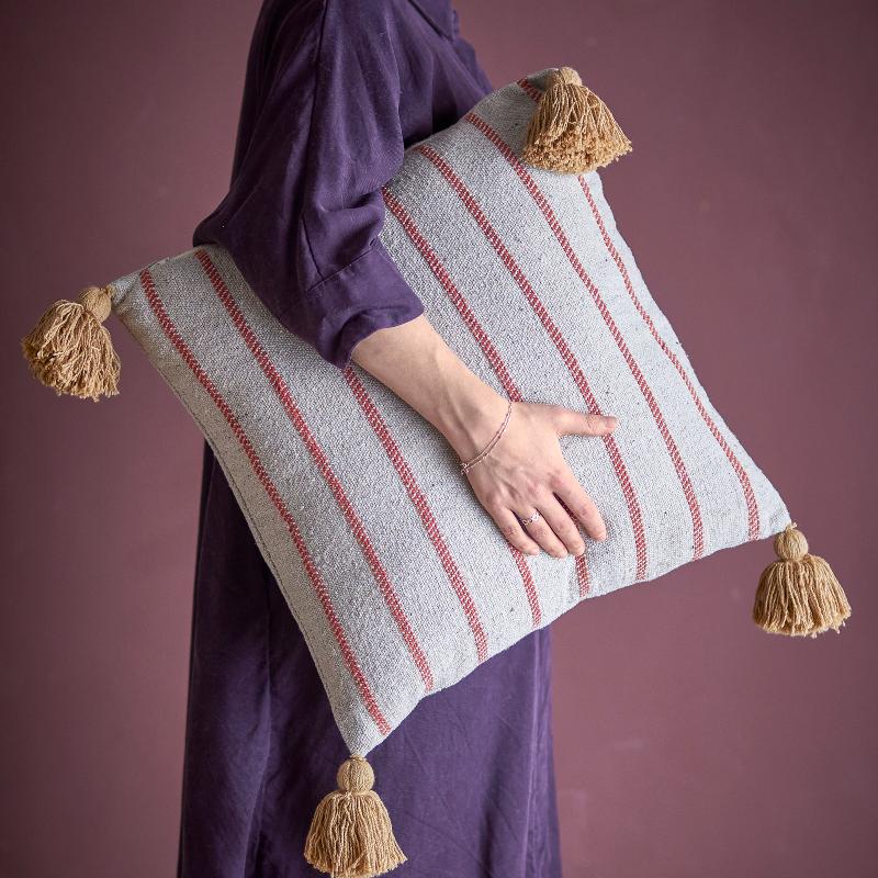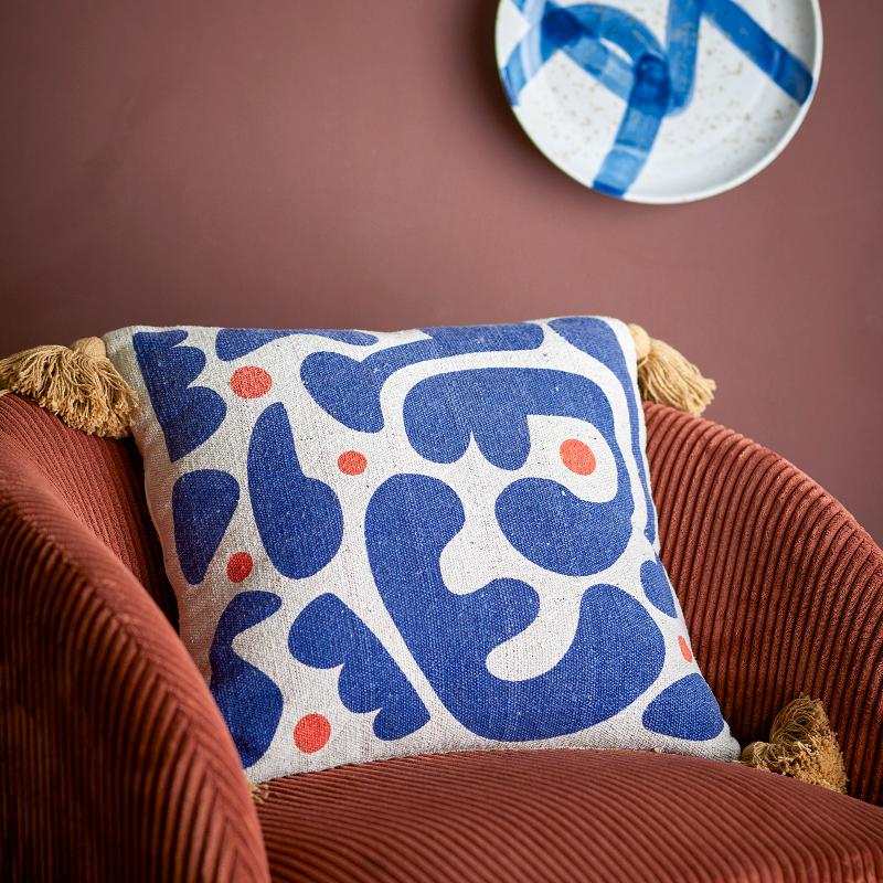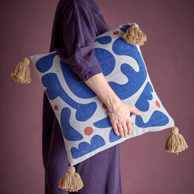 Подушка в спокойном голубом тоне украшена мягким узором и кисточками по углам. Она помогает обновить пространство без кардинальных изменений, добавляя цвет и текстуру. Формат 45×45 см делает её удобной для сочетания с другими подушками на диване или кровати, создавая аккуратную и продуманную композицию.