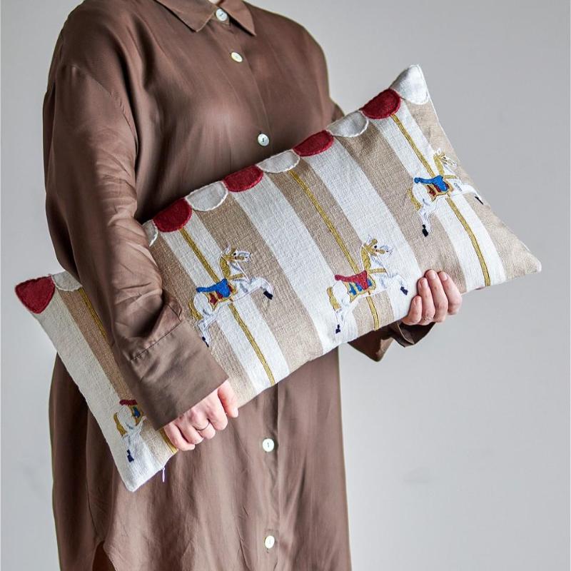 Подушка с каруселью — машинная и ручная вышивка создают объём и текстуру. Лошадка-качалка в центре, ностальгический мотив без приторности. Формат 60 на 30 — вытянутый прямоугольник, который удобно класть на диван или изголовье кровати. Рождественская коллекция, но работает круглый год, если вы любите винтажную атмосферу. Хлопок, нейтральный кремовый фон, детали прорисованы аккуратно. Bloomingville умеет добавлять сказку, не скатываясь в китч.