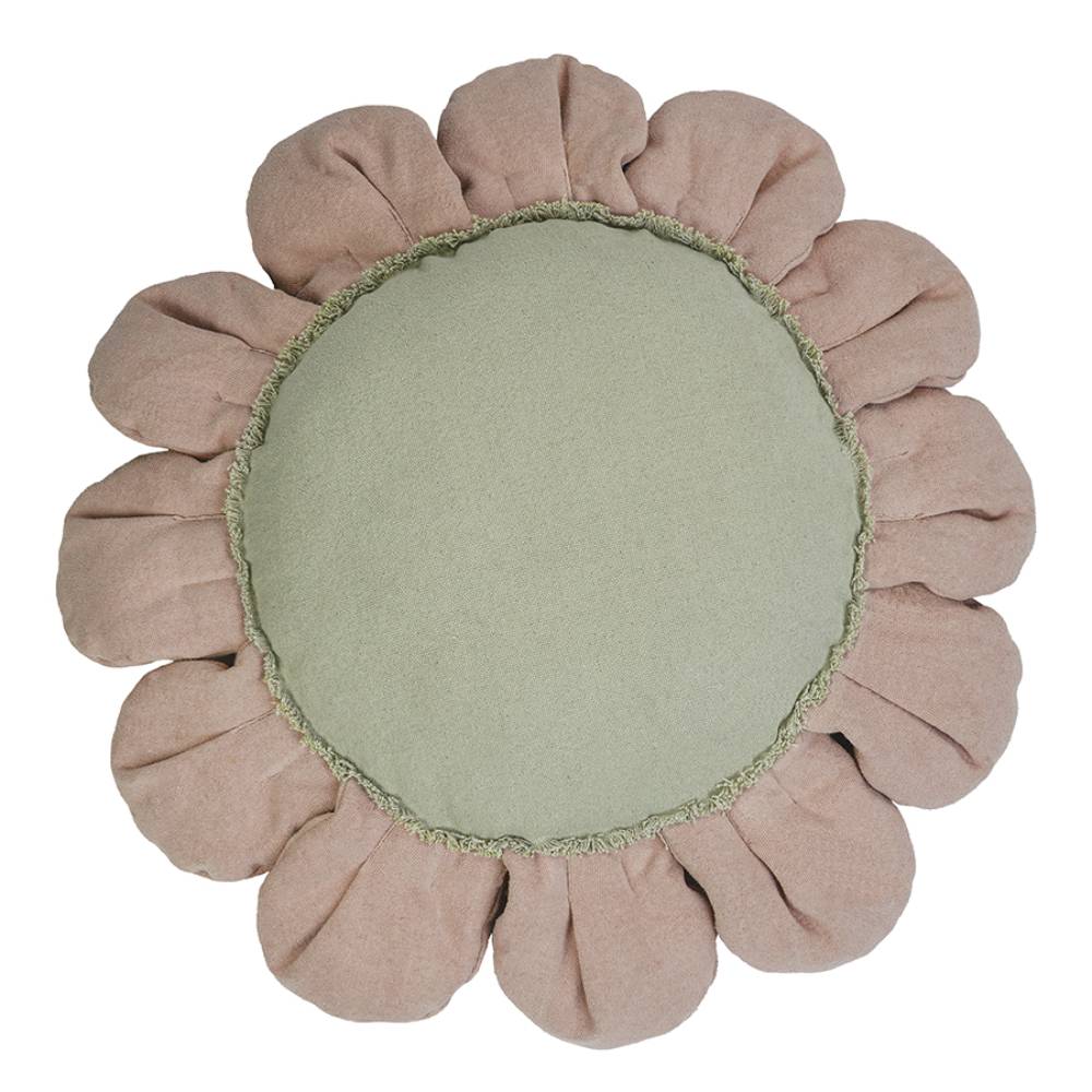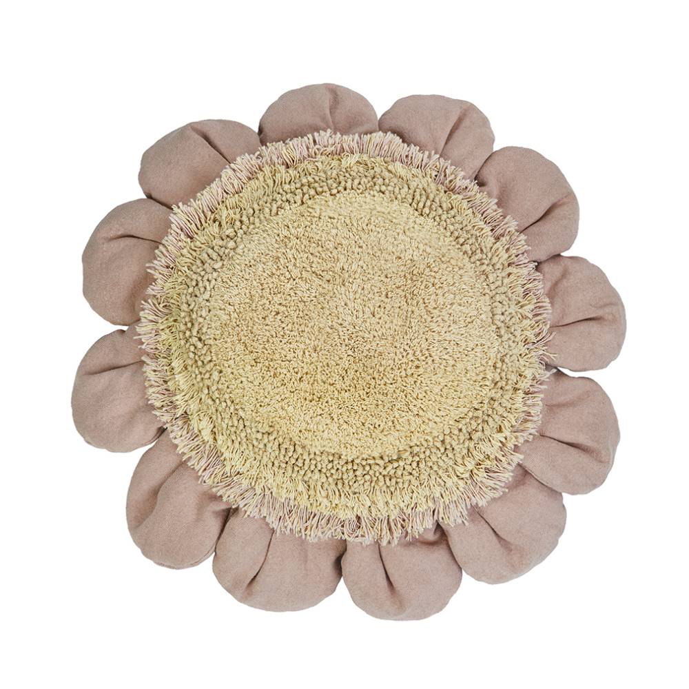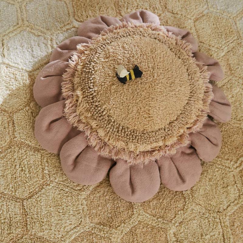 Подушка в форме ромашки — большая, мягкая, с розовыми лепестками из хлопкового полотна и золотистой серединкой из тафтинга. В комплекте идёт маленькая текстильная пчёлка. Ребёнку на ней удобно лежать, читать, играть — она достаточно большая, чтобы устроиться по-настоящему. Хорошо выглядит и в детской, и в игровом уголке, особенно если поставить рядом несколько штук.