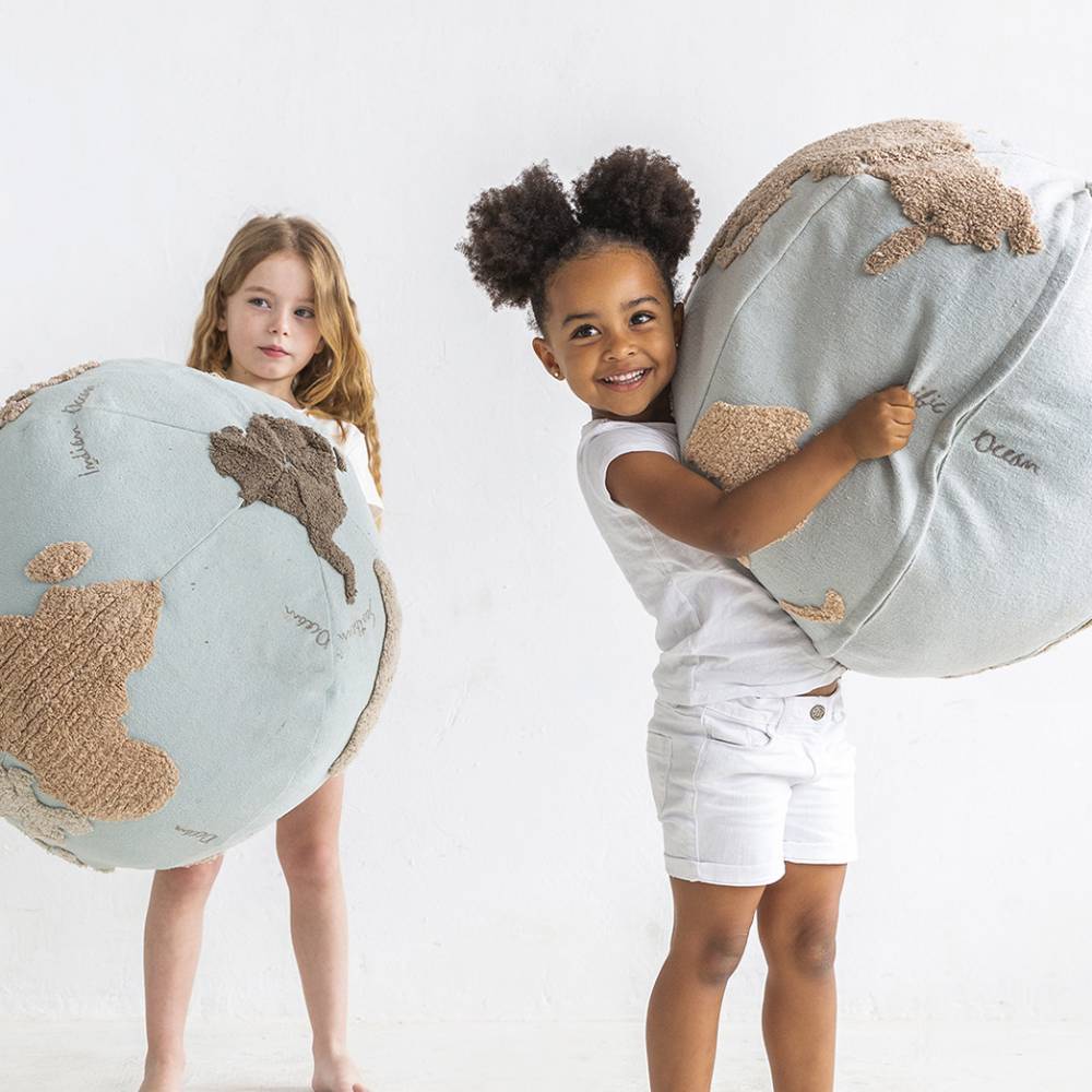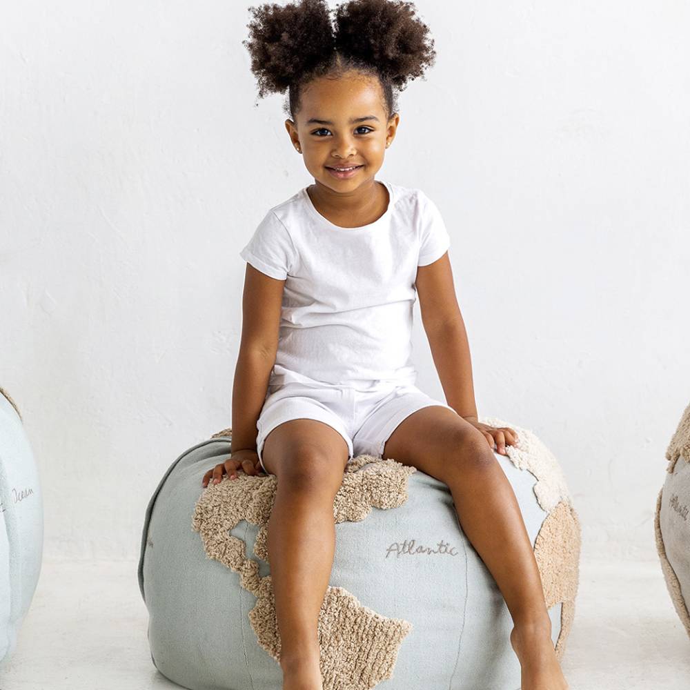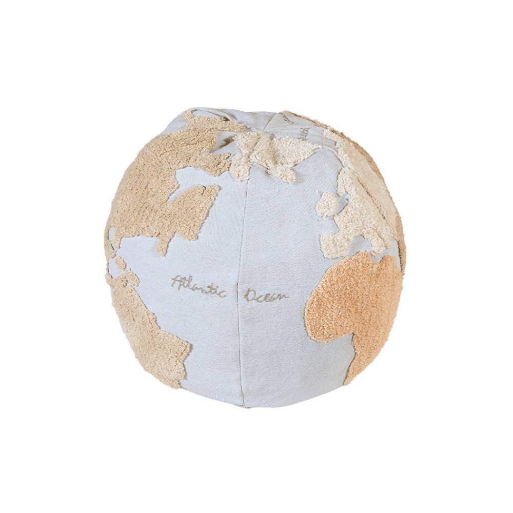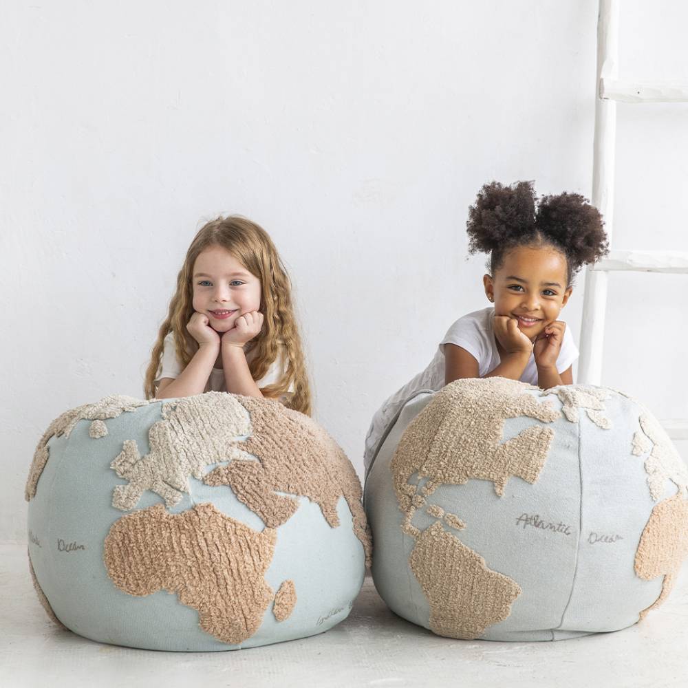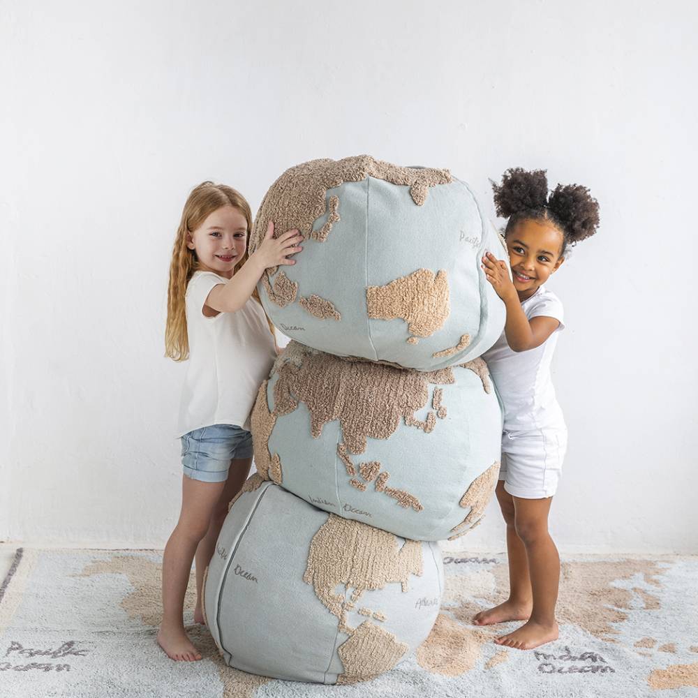 Пуф в форме земного шара — с континентами, вышитыми названиями океанов и голубым основанием. Ребёнок может на нём сидеть, лежать, показывать страны и придумывать маршруты. Лёгкий внутри — набит смесью переработанных волокон и полистирольных шариков, поэтому его легко двигать и переносить. Чехол снимается через молнию и стирается в машинке.