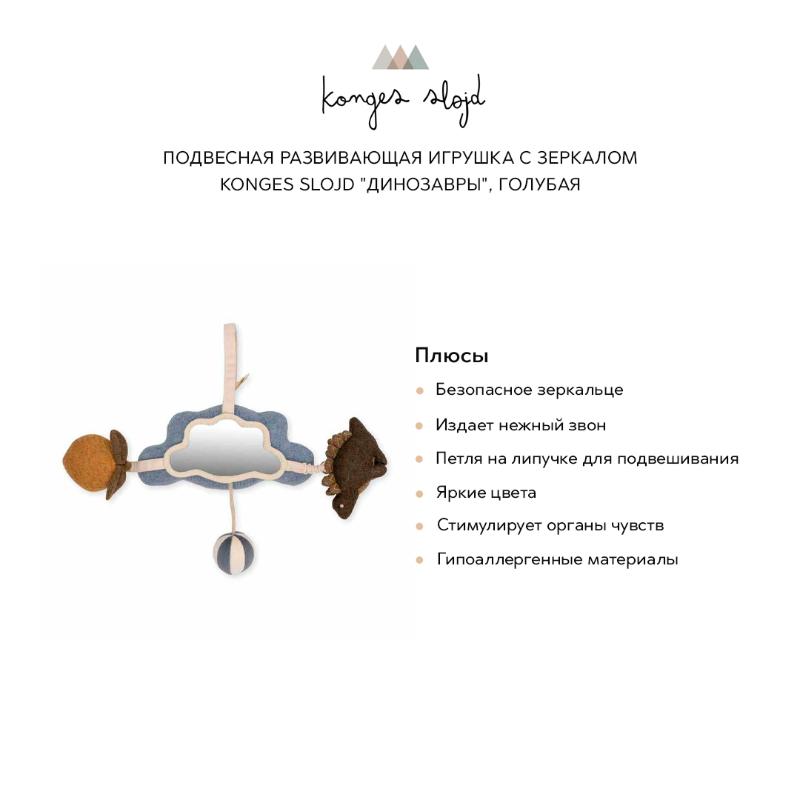 Имеет пластиковое зеркало и дополнена развивающими деталями, которые идеально подойдут для маленьких ручек. Выполнена с применением различных текстур, имеет эластичные ремешки, силиконовую игрушку и маленькие фигурки с колокольчиками внутри, которые издают нежный звенящий звук. Игрушка также оснащена практичной петлей для подвешивания на липучке.