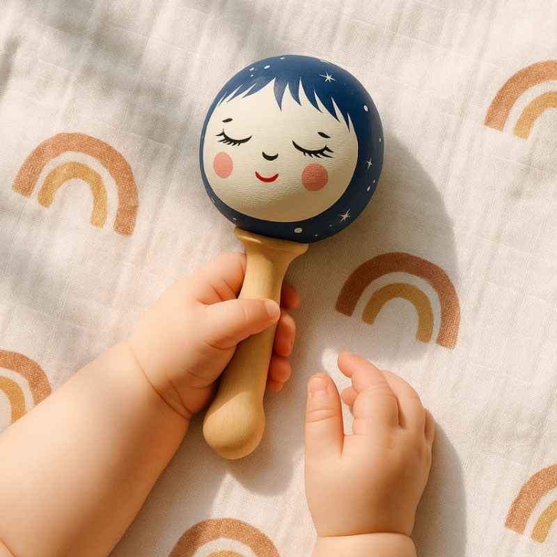Эта очаровательная деревянная погремушка-маракас создана, чтобы радовать малышей с первых дней. Лёгкая и удобная для детских ручек, она издает мягкий звук, который увлекает и успокаивает. Весёлое лицо с закрытыми глазками и яркими щёчками делает игрушку по-настоящему дружелюбной, а безопасные материалы и гладкая поверхность позволяют играть без забот. Отличный спутник для первых музыкальных открытий.