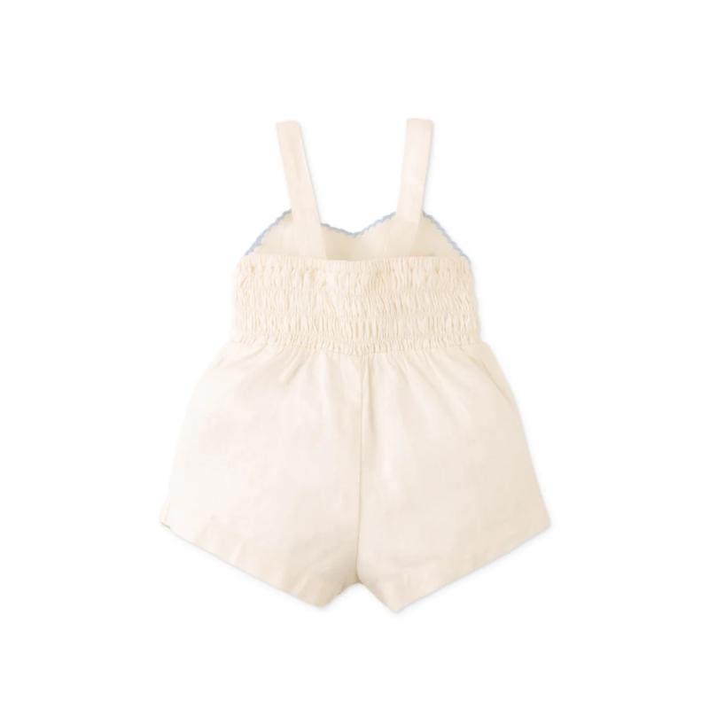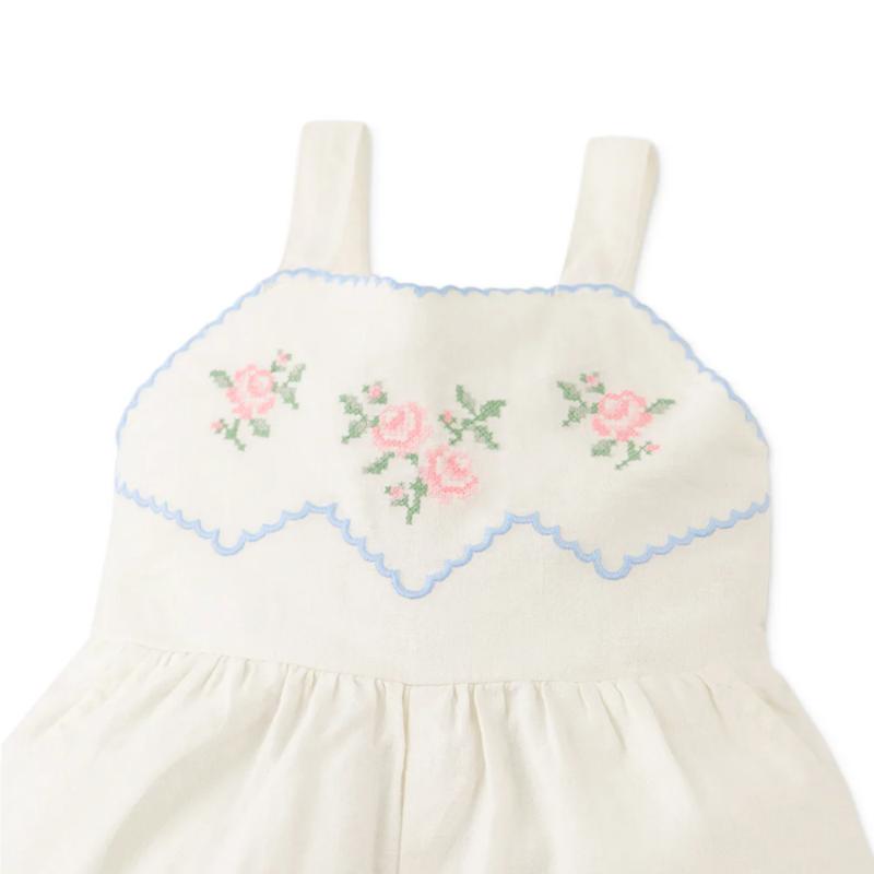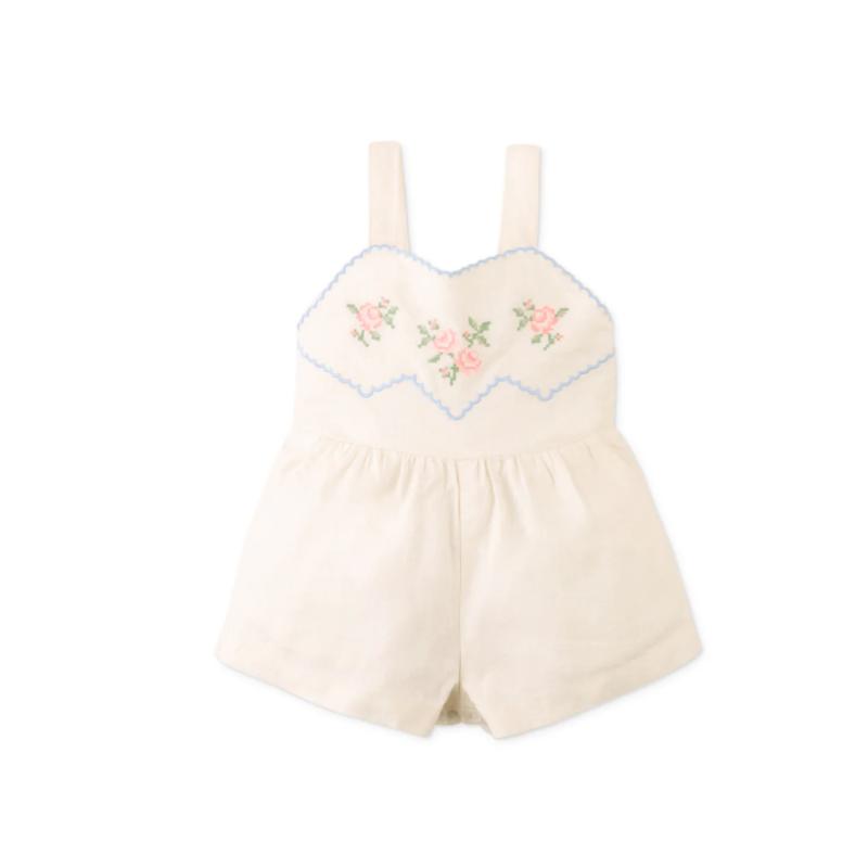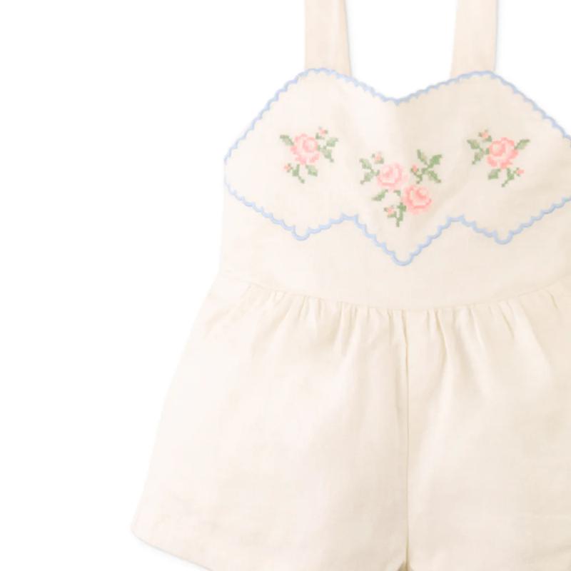Полукомбинезон с вышивкой из роз выглядит нежно и аккуратно. Свободный крой обеспечивает комфорт в движении, а мягкая посадка подходит для активного дня. Резиночки на спинке удобно фиксируют модель, не сковывая ребенка. Подходит для прогулок и теплого сезона.
