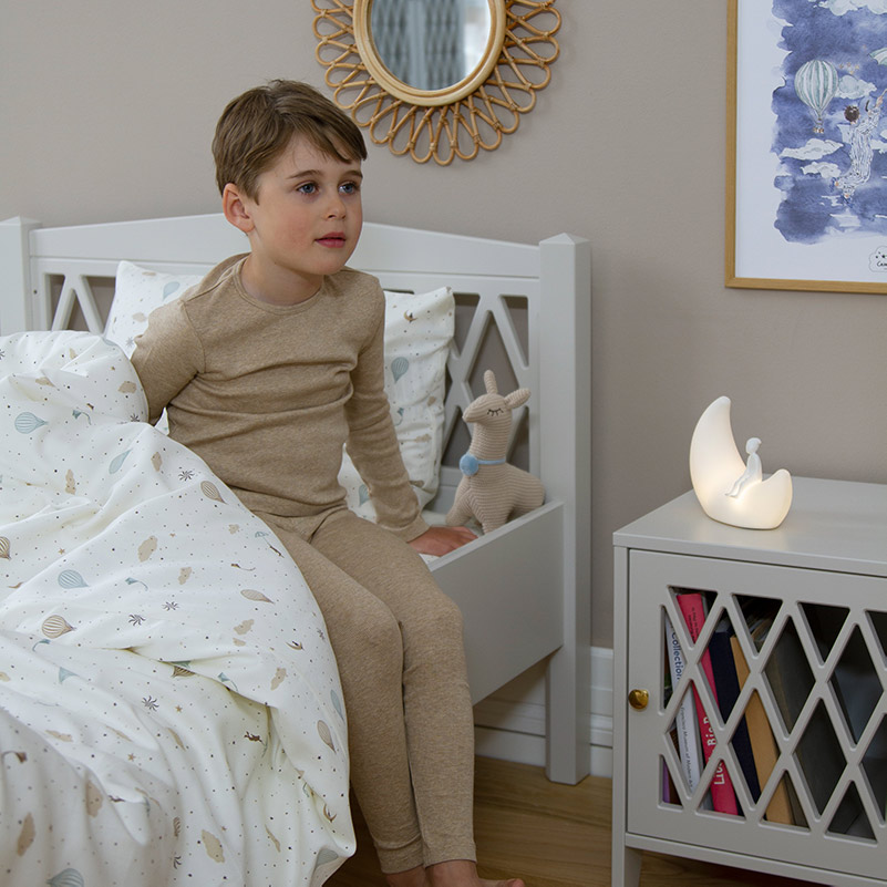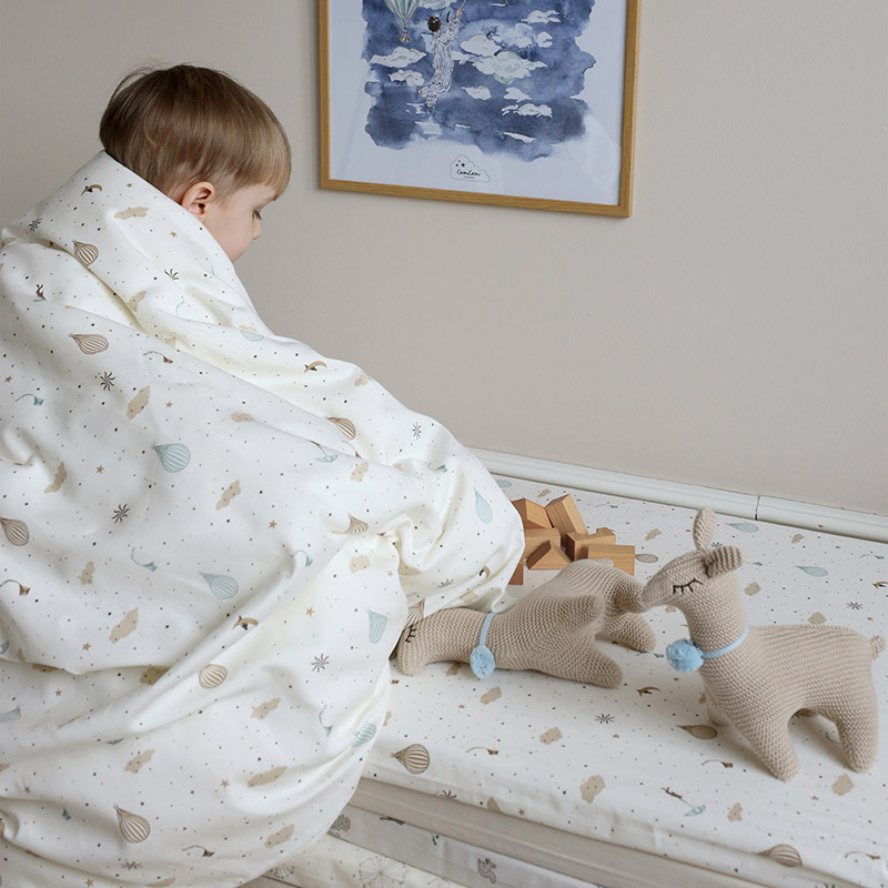 Комплект из пододеяльника и наволочки для подросшего малыша. Принт Dreamland со звёздами и облаками создаёт атмосферу спокойствия перед сном. Молочный цвет — база, которая не наскучит и легко комбинируется с другим текстилем в комнате. Органический хлопок с каждой стиркой становится мягче, а качество пошива гарантирует долговечность. Это постельное бельё, в котором хочется засыпать.