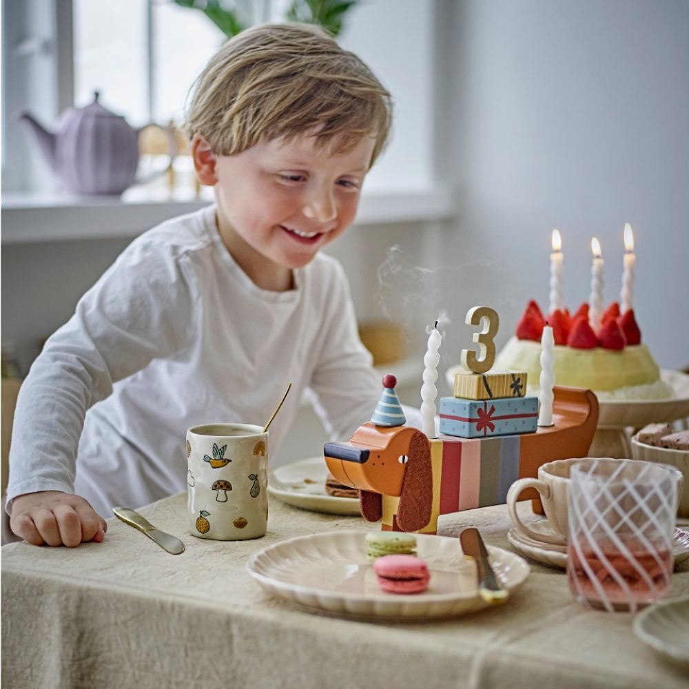 Красиво декорировать комнату к вечеринке по случаю дня рождения вашего малыша и создать в ней праздничную атмосферу вам поможет этот оригинальный декор Bloomingville. Он выполнен в виде забавного песика в ярком колпаке, который принес крохе подарки. На его спинке можно установить две свечки, а также цифру, соответствующую количеству лет именинника. Все элементы изготовлены из натурального лотосового дерева, качественной фанеры и МДФ и покрыты нетоксичной краской, а значит, полностью безопасны для детского здоровья.