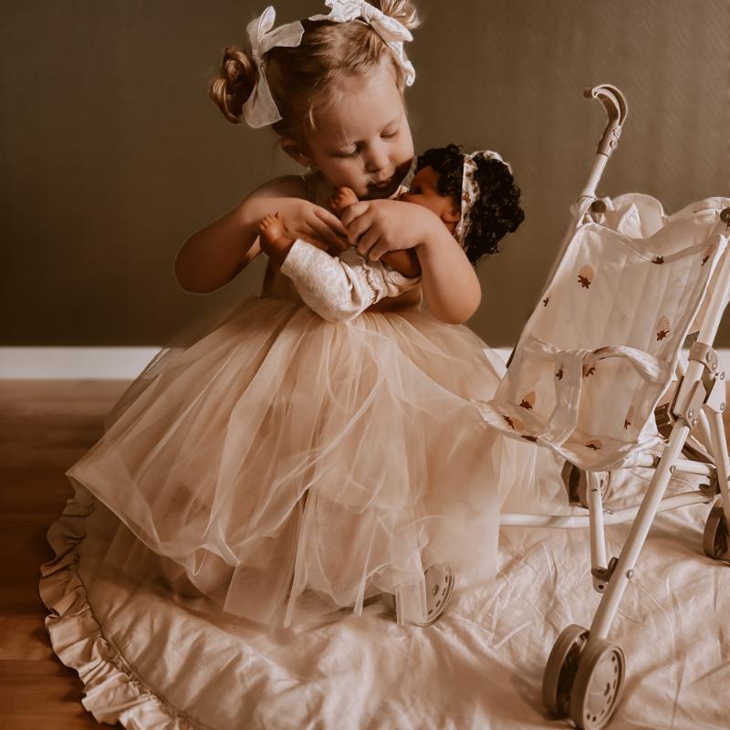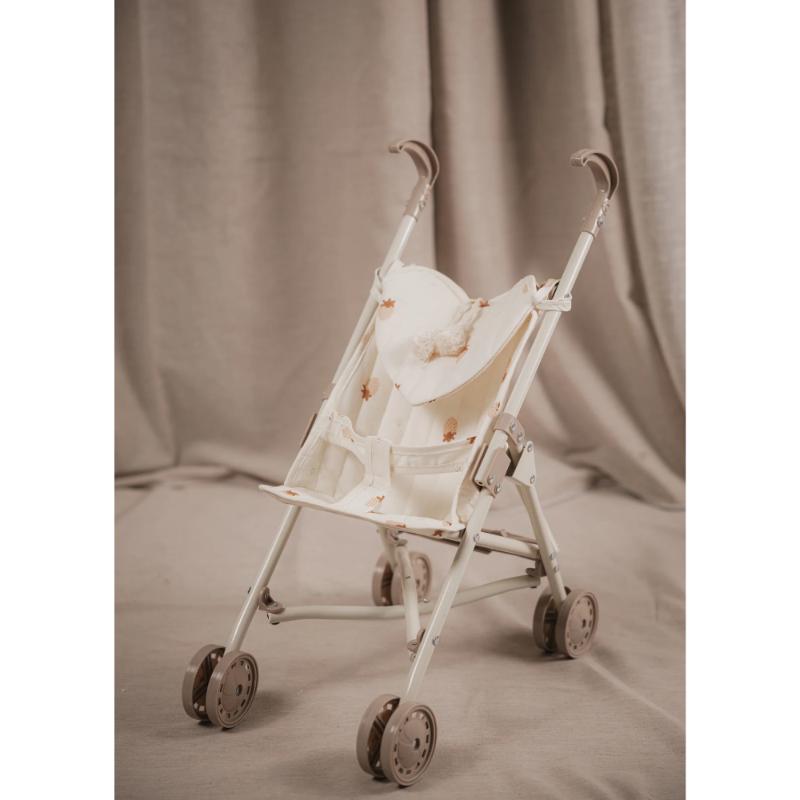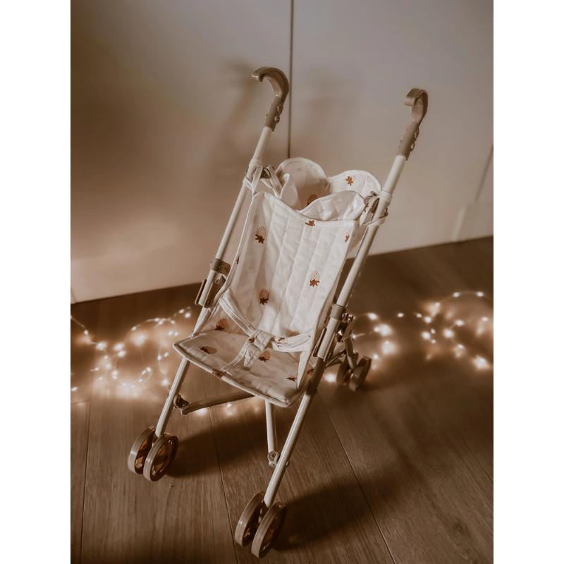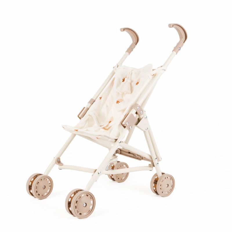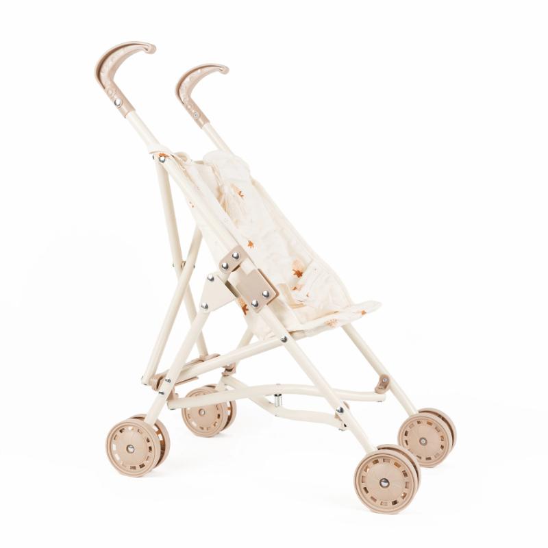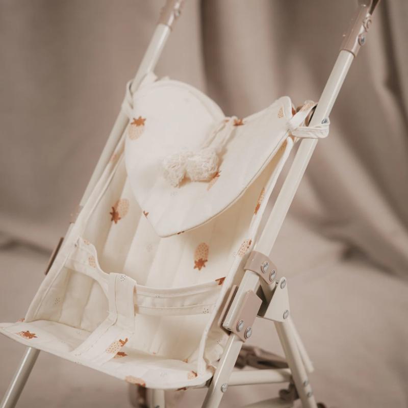 Коляска с ярким принтом клубники — весёлая и летняя. Ткань съёмная и легко стирается, что очень удобно в процессе игры. Спереди есть сердечко-кармашек: туда влезет кукольная бутылочка, носочек или шапка. Устойчивая рама из железа с двойными колёсами на всех четырёх ножках. Хороший вариант для тех, кто любит цветные и живые принты. Для детей от 3 лет.