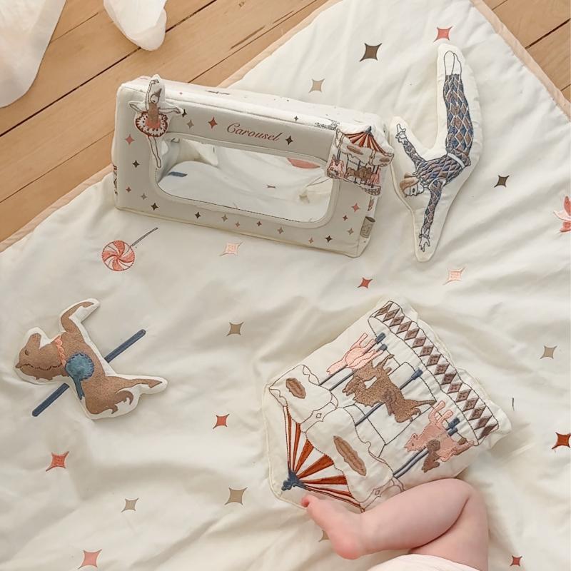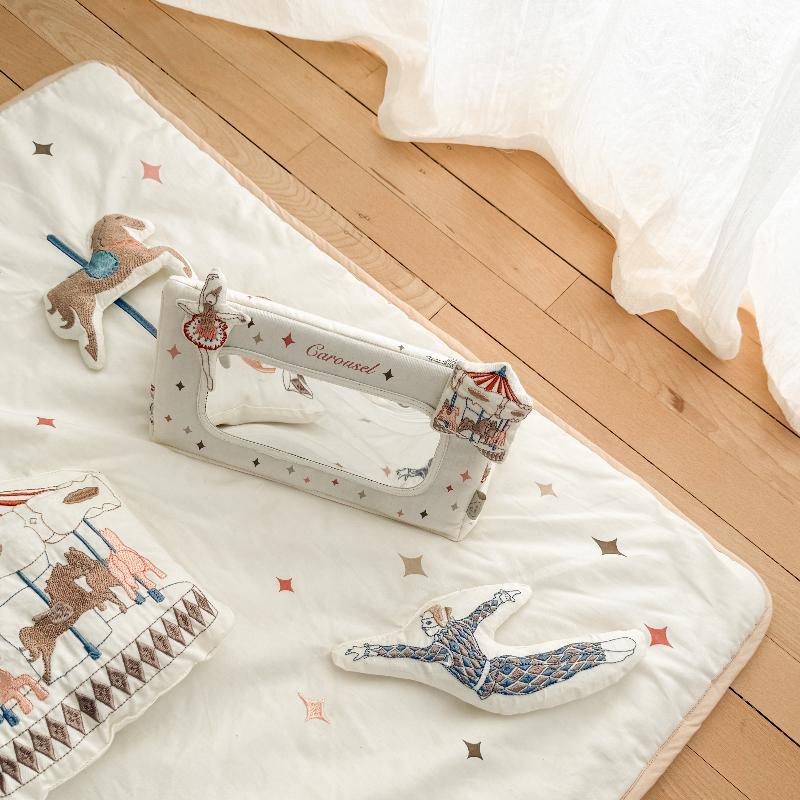Безопасное зеркало в мягком текстильном обрамлении помогает малышу исследовать своё отражение. Принт Carousel добавляет декоративности, кремовый оттенок спокойный. Игрушку можно положить перед ребёнком во время занятий на животике или подвесить на дугу развивающего коврика. Зеркальная поверхность небьющаяся, все материалы безопасны. Это простой, но эффективный инструмент для развития самовосприятия и концентрации внимания.