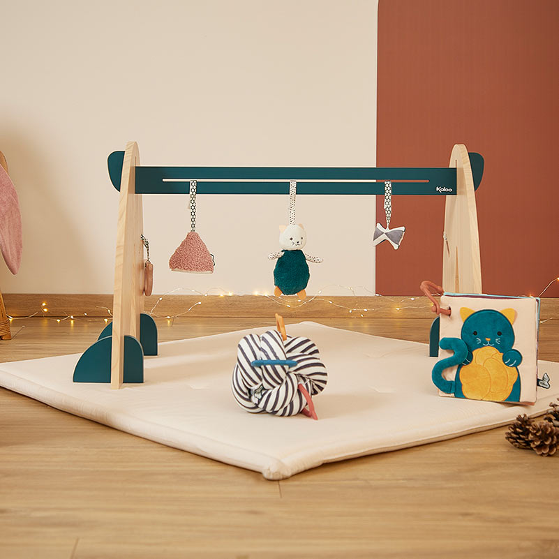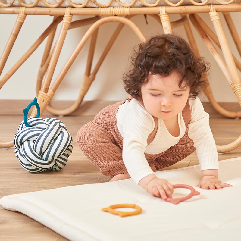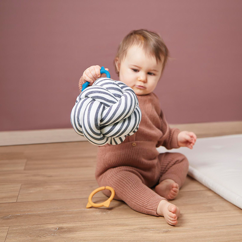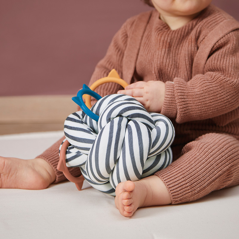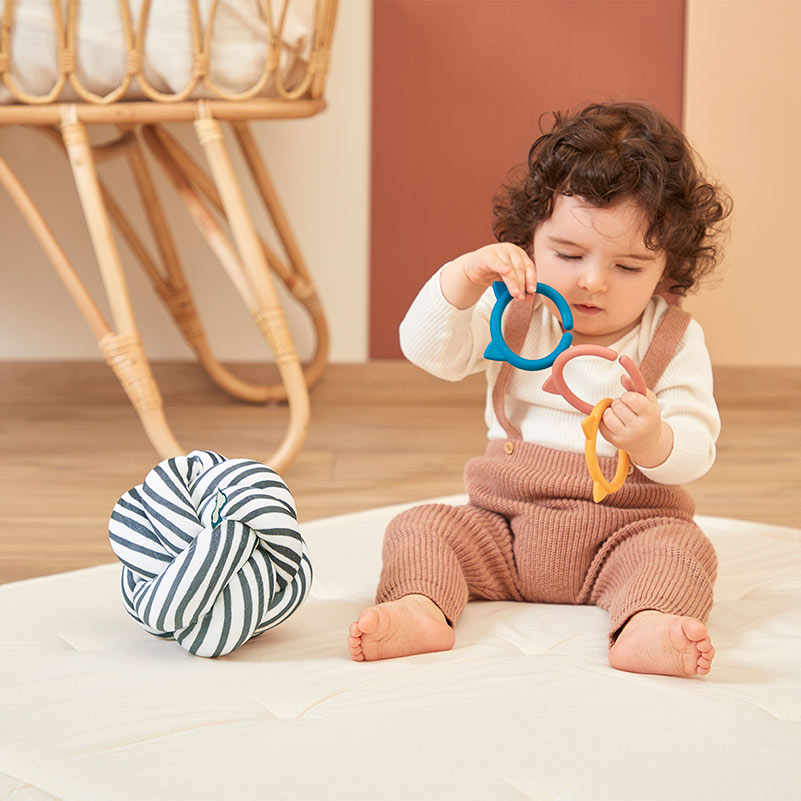 Сенсорный мяч для развития малыша с рождения из коллекции Stimuli, разработанной совместно с психомоторными терапевтами. Оригинальная форма из переплетающихся узлов делает мяч легким для захвата крошечными ручками и стимулирует мелкую моторику. Контрастные узоры помогают развивать зрение малыша, который лучше воспринимает контрасты с рождения. Три съемных силиконовых кольца в форме кошечек разных цветов можно менять местами на мяче, постоянно пробуждая любопытство ребенка — он обожает хватать их. Кольца также служат грызунками для облегчения болезненного прорезывания зубов и массажа воспаленных десен. Мягкий и удобный мяч из микровельвета способствует развитию чувств малыша деликатно и в его собственном темпе. Идеален как подарок на рождение.