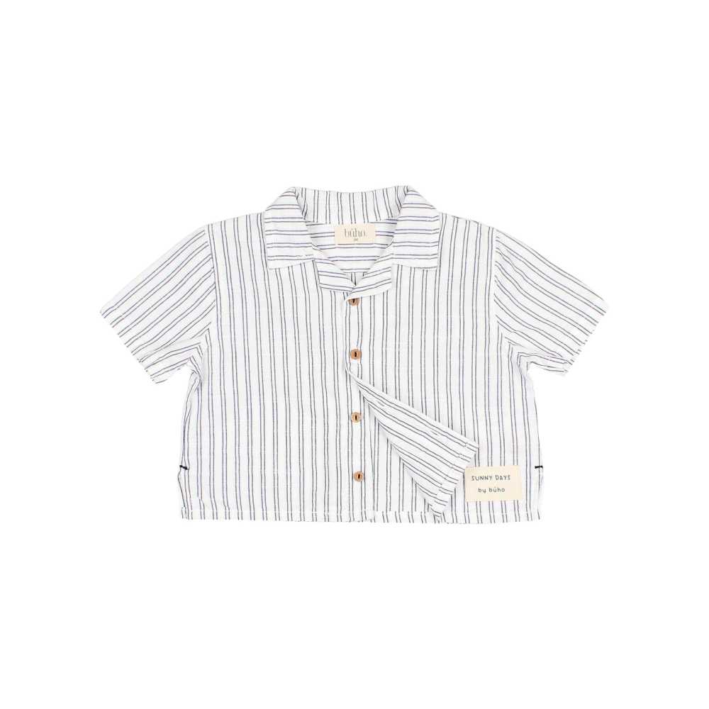 Эта рубашка с белыми полосками придаст изысканности любому образу. Легкая и комфортная ткань идеально подходит для теплых дней, а стильный дизайн с аккуратными манжетами и воротником добавляют элегантности. Она подходит как для повседневных прогулок, так и для более торжественных случаев. Удобная и стильная рубашка, которая будет легко сочетаться с джинсами или брюками, создавая стильный и аккуратный образ для вашего малыша.