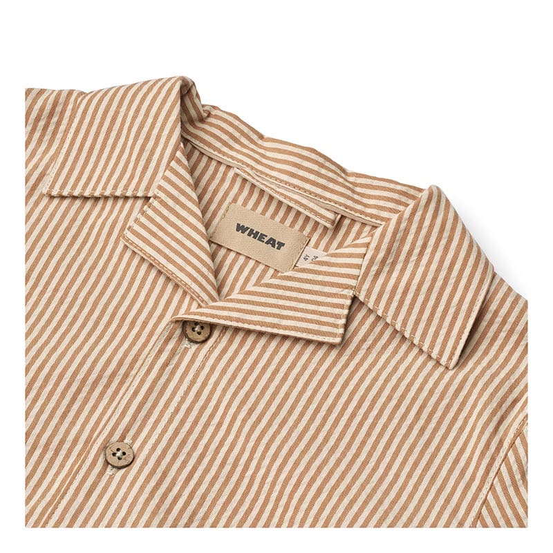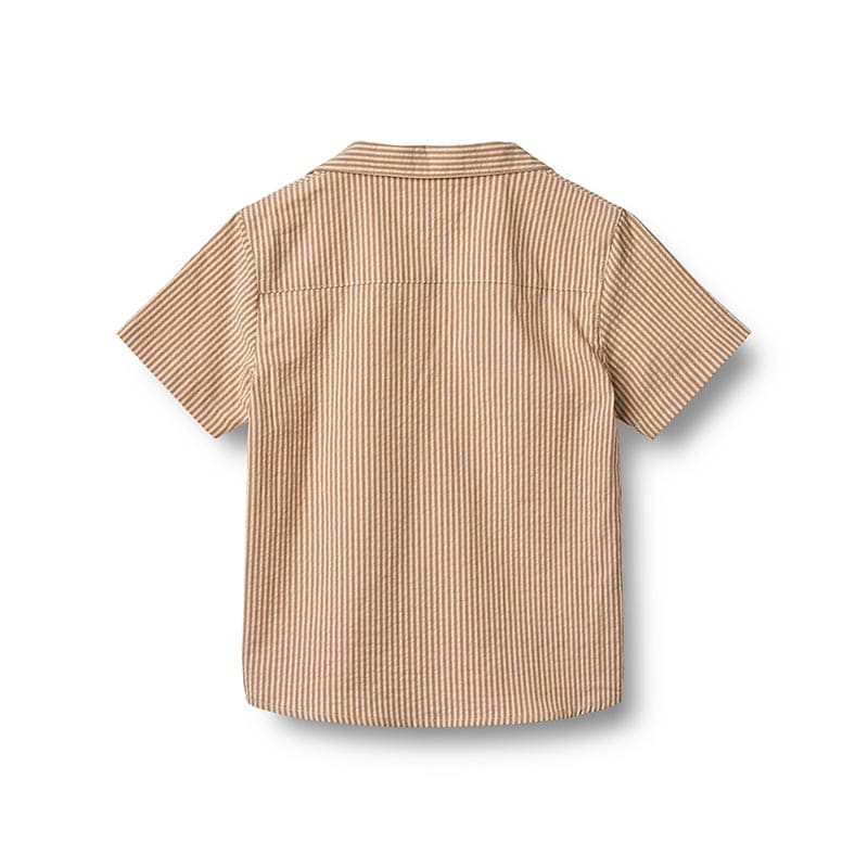 Рубашка с коротким рукавом в карамельную полоску – стильное дополнение детского гардероба. Легкая и приятная на ощупь ткань дарит комфорт даже в жаркую погоду. Прямой крой обеспечивает свободу движений, а классический воротник и аккуратная планка с пуговицами придают модели элегантный вид. Универсальный дизайн легко сочетается с шортами, брюками и комбинезонами, создавая гармоничные летние образы.