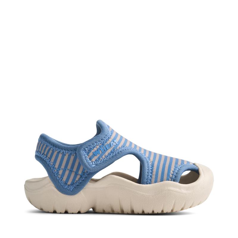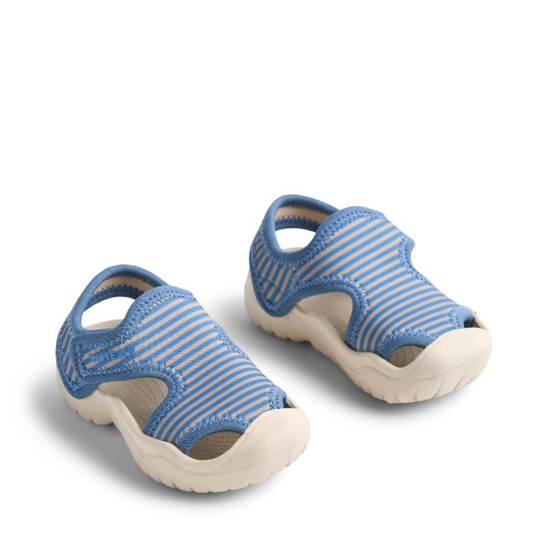 Полосатые сандалии в голубых тонах. Застежки-липучки настраиваются под ногу. Открытые, хорошо вентилируются. Мягкая внутренняя часть, гибкая подошва. Легкий вес, комфорт в жару. Быстро обуваются. Для пляжа, бассейна, прогулок летом. Морской дизайн в полоску. Практичные, можно мочить. Быстро сохнут после воды. Удобные для активных игр. Стильные летние сандалии для мальчиков и девочек.