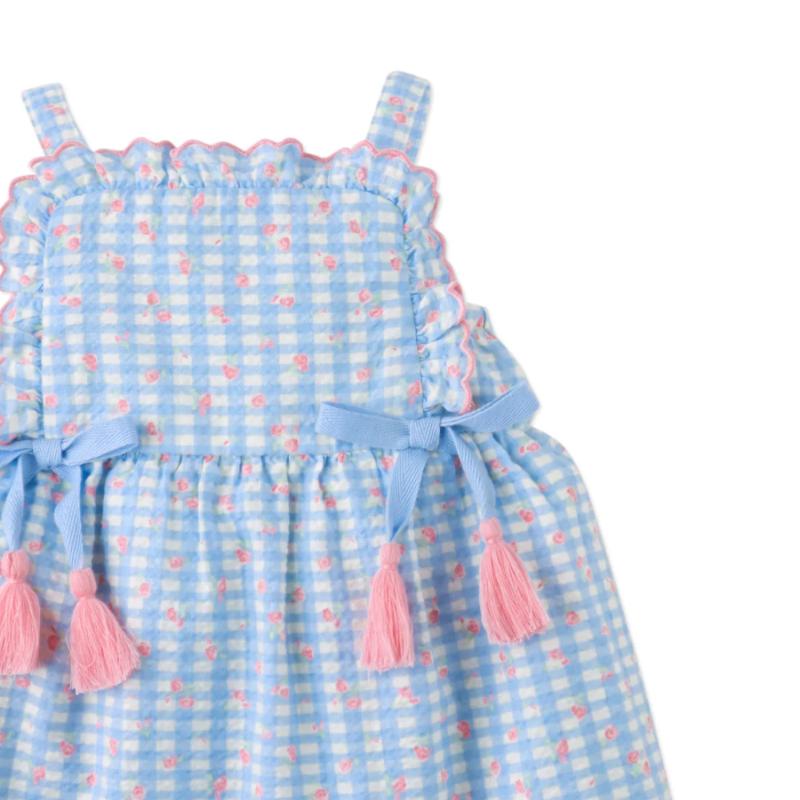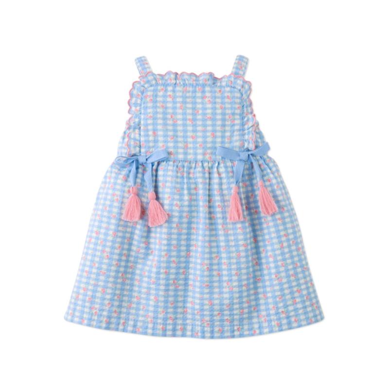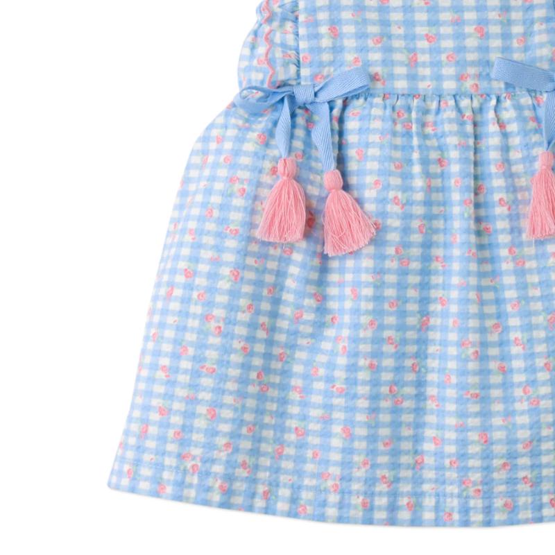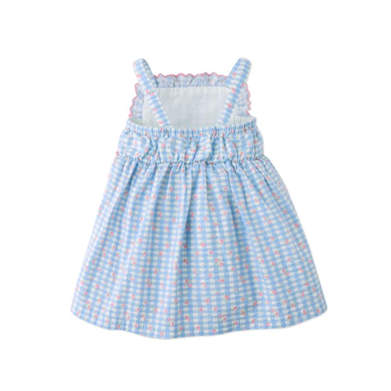 Это голубое хлопковое платье в клетку с цветочным принтом — настоящий союз двух миров: строгой геометрии и нежной природной игривости. Клетка задает аккуратный, собранный ритм, а цветы, рассыпанные по ткани, смягчают образ, делая его по-настоящему девичьим. Верх платья украшен нежным фестоном — волнистый край обрамляет декольте, добавляя кружевной легкости. Вышитые оборки и игривые бантики довершают ансамбль, привнося в него беззаботный шарм. Платье одновременно и игривое, и элегантное — в нем можно и на праздник, и на прогулку, и на фотосессию.