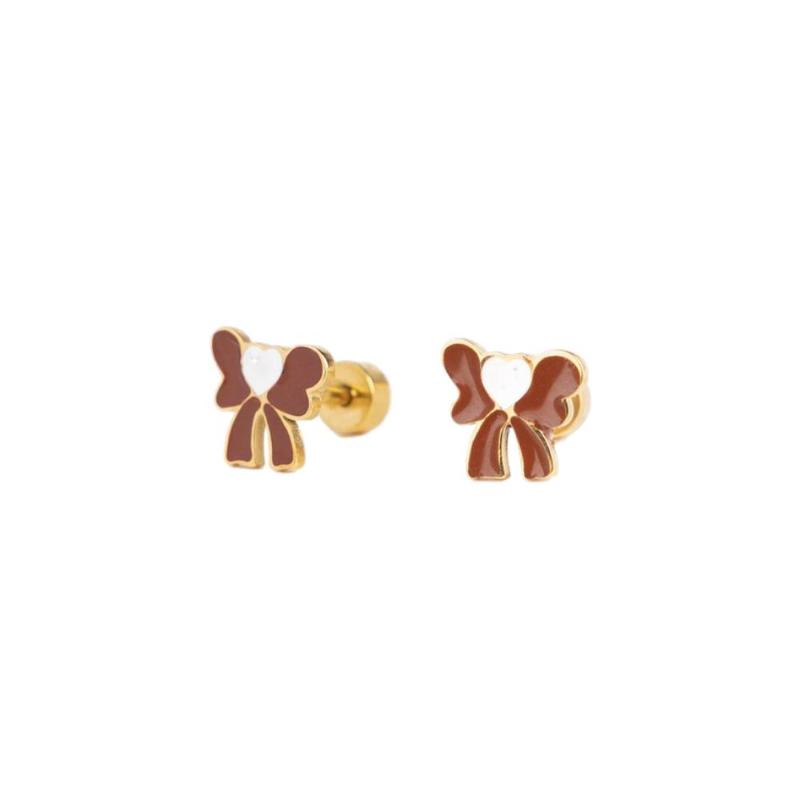 Романтичные бантики в двух парах с надёжной винтовой системой закрытия. Прочная нержавеющая сталь с 18k золотым покрытием выдерживает активную детскую жизнь. Медицинский сплав применяется в детской бижутерии благодаря гипоаллергенности — никеля, свинца и меди в составе нет. Винтовой замок 0,8 х 10 мм комфортен даже для сна, не давит на мочку. Яркие цвета, модные формы. Размер 0,6-0,8 мм.