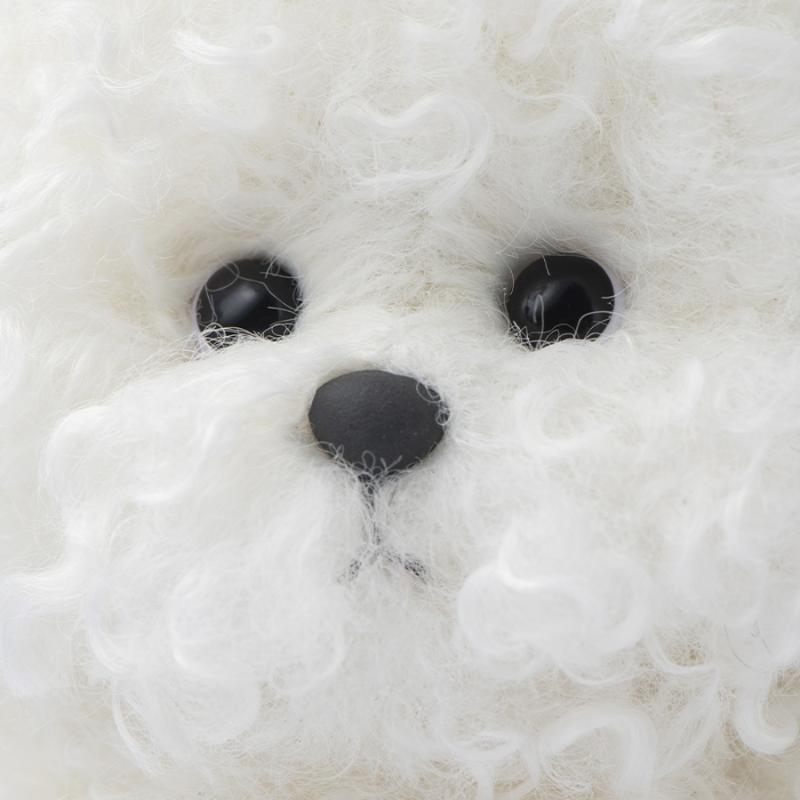 Щенок породы бишон фризе воплощён в цвете маршмелоу — нежном сливочно-белом оттенке, как зефир. Кудрявая шерсть передаёт характерную особенность породы, создавая объёмную пушистую текстуру. Чёрные глазки-бусинки и носик-пуговка контрастируют с светлым мехом. Бишон выглядит жизнерадостным и дружелюбным, как настоящие представители этой породы. Идеальный друг для тех, кто мечтает о собаке, но пока довольствуется плюшевой версией.