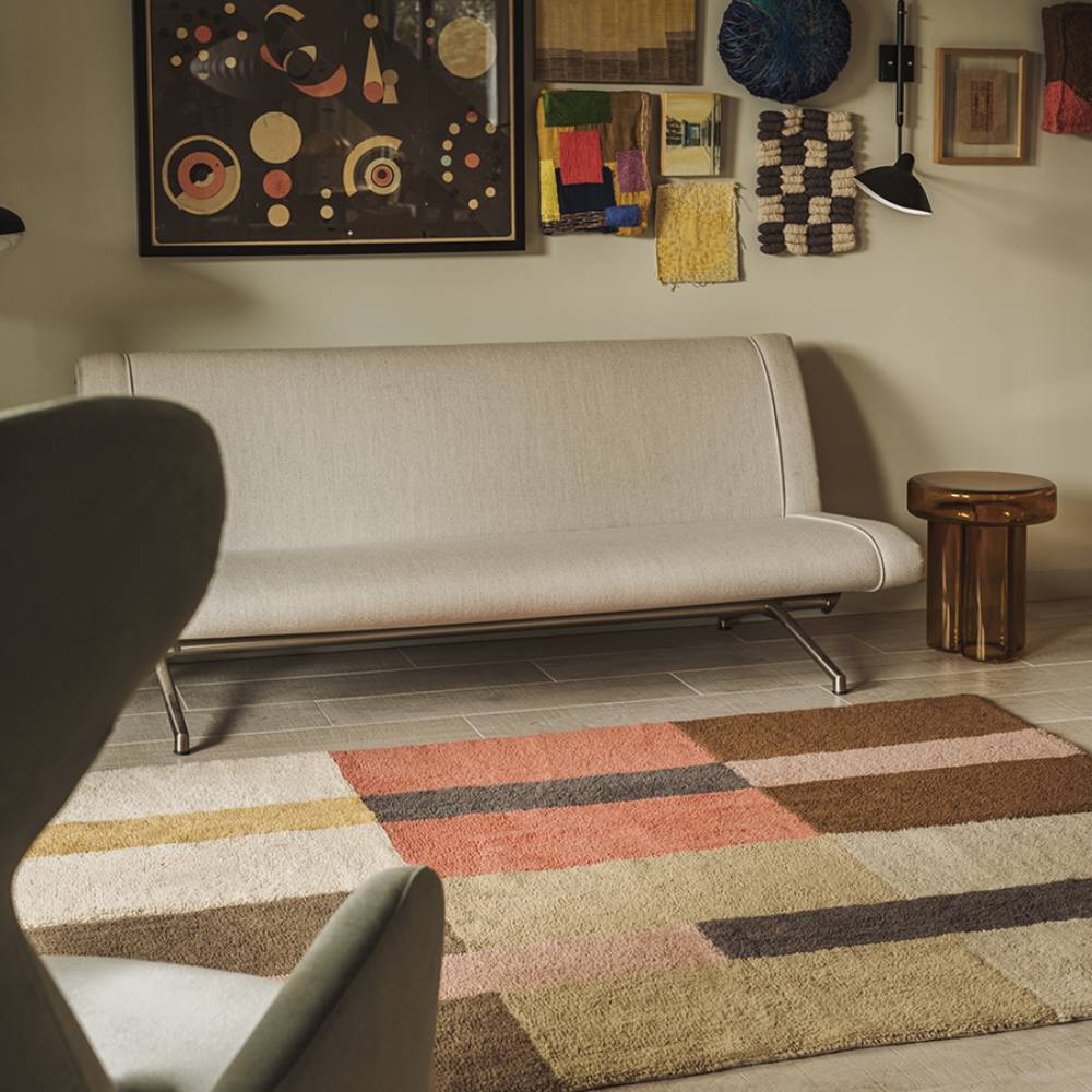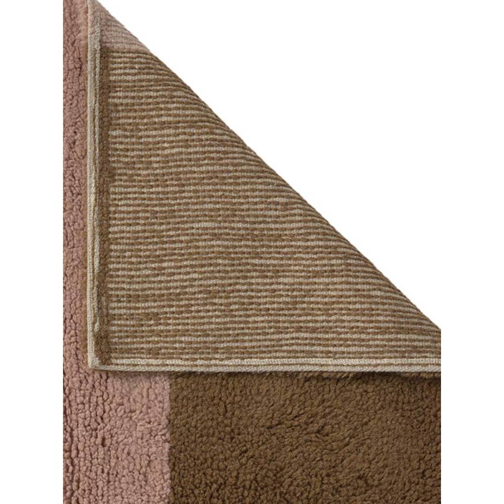 Длинная узкая дорожка с геометричным рисунком — блоки кораллового, орехового и молочного цветов, разделённые тонкими полосками. Хорошо ложится вдоль кровати, в коридоре или у детского стола. Шерсть, ручная работа, натуральные красители. Стирается в машинке, идеальное сочетание красоты и функциональности для повседневной жизни.