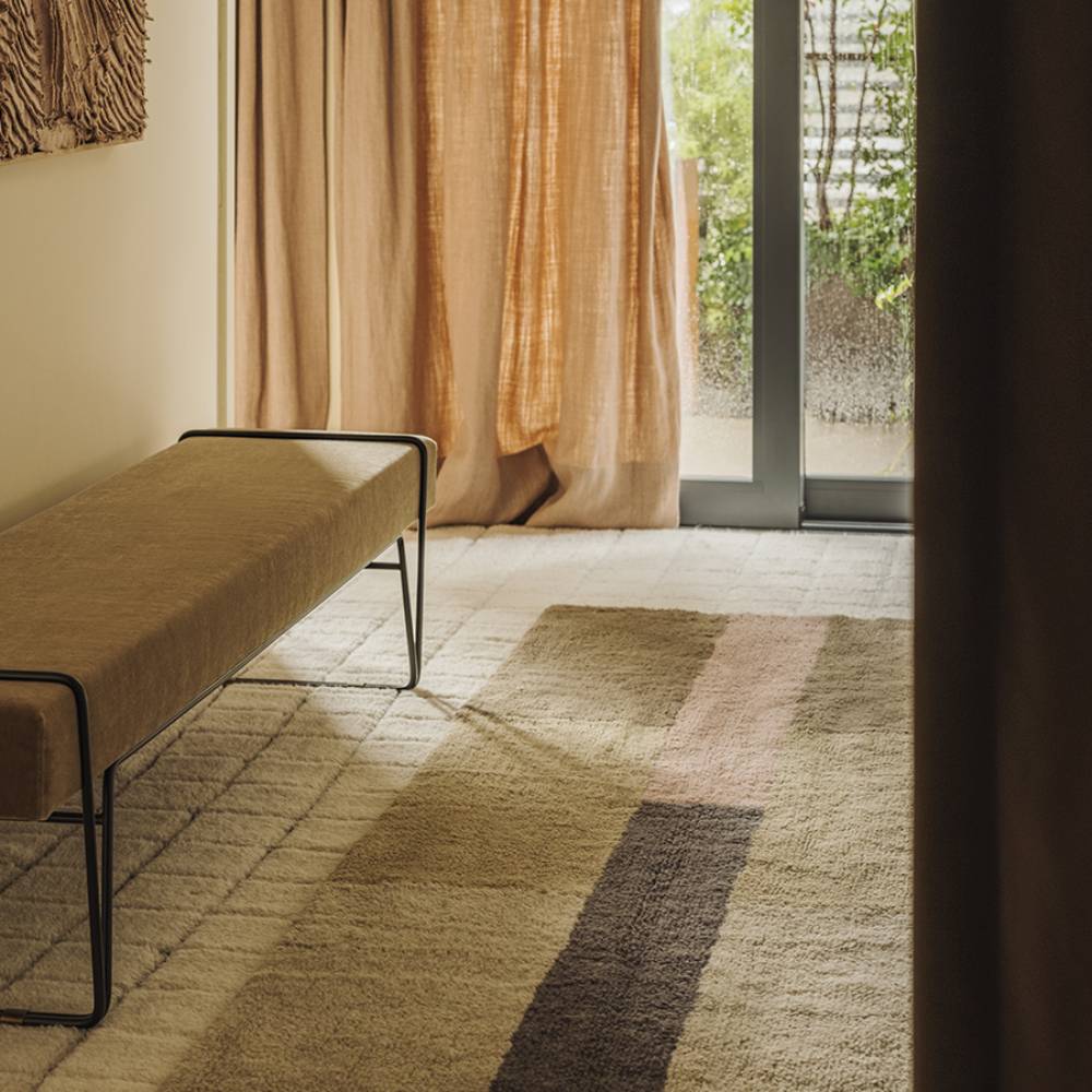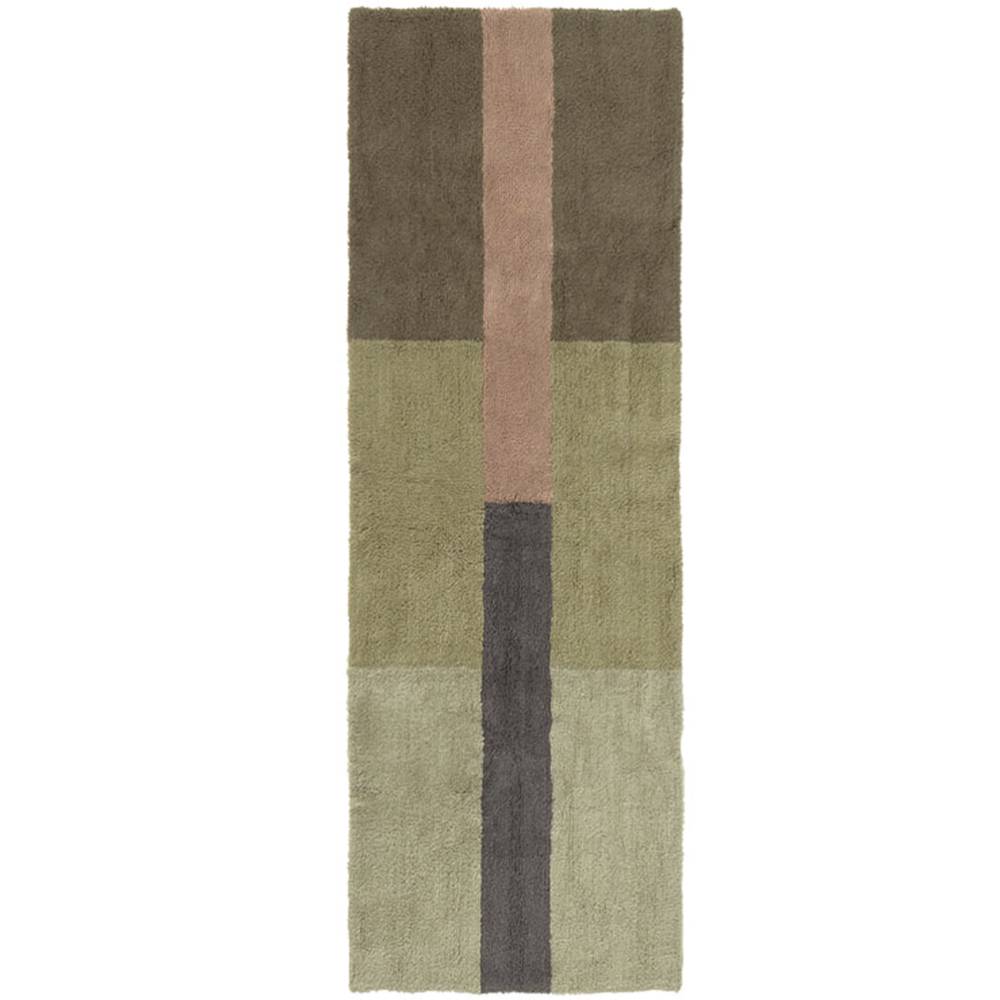 Узкая шерстяная дорожка в пыльно-розовых тонах с геометричным рисунком из цветных блоков и разделительных полос. Розовый здесь не яркий — скорее приглушённый, почти винтажный, и именно поэтому выглядит дорого. Подходит для прикроватной зоны или коридора. Стирается в машинке, в комплекте идет практичная сумка для хранения.
