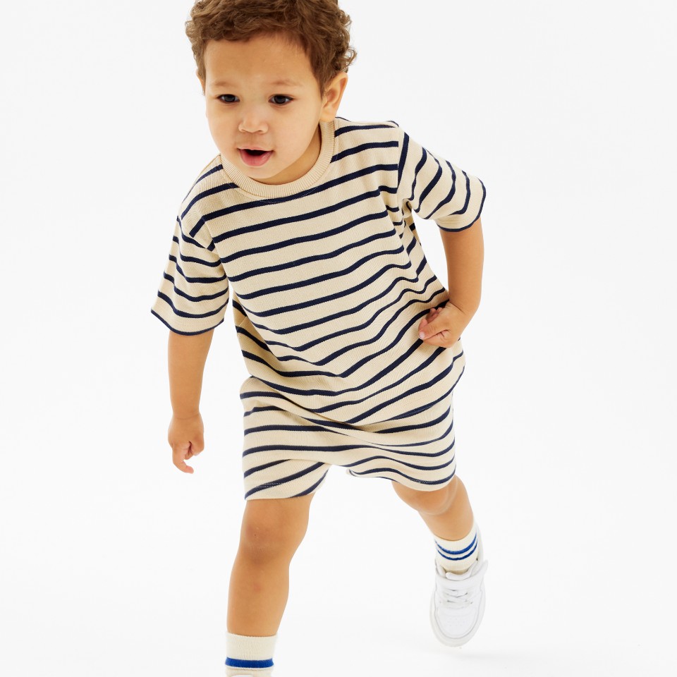Шорты с морской полоской — идеальны для теплых дней, когда хочется чего-то легкого и яркого. Мягкая и дышащая ткань не ограничивает движений, а удобный крой позволяет малышу чувствовать себя свободно. Шорты с полосатым принтом станут ярким акцентом в летнем гардеробе, добавляя веселый и стильный элемент. Их можно легко сочетать с различными футболками и рубашками, создавая не только комфортный, но и модный образ для активных игр и прогулок на улице.
