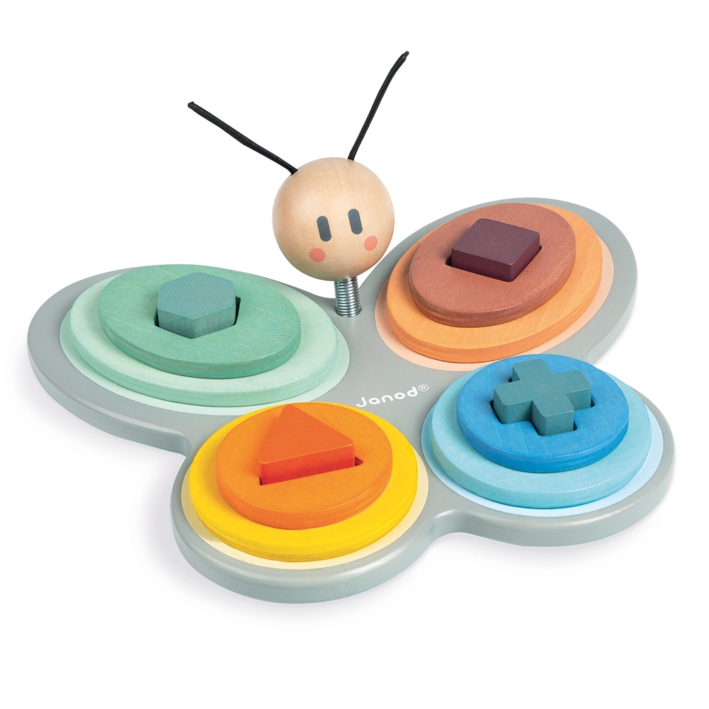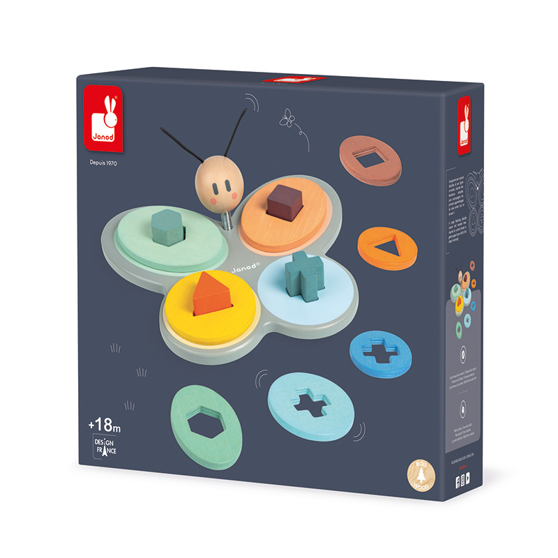 Яркая бабочка из дерева с крыльями-головоломкой. На доске-основе 15 углублений разной формы, задача — расположить цветные детали правильно. Ребёнок изучает геометрические фигуры, тренирует координацию и учится сопоставлять формы. Древесина сертифицирована по стандартам FSC, краски нетоксичные. Сортер подходит для малышей от полутора лет и остаётся интересным долго — каждый раз можно собирать быстрее. Красивая вещь, которую не стыдно оставить на виду в детской.