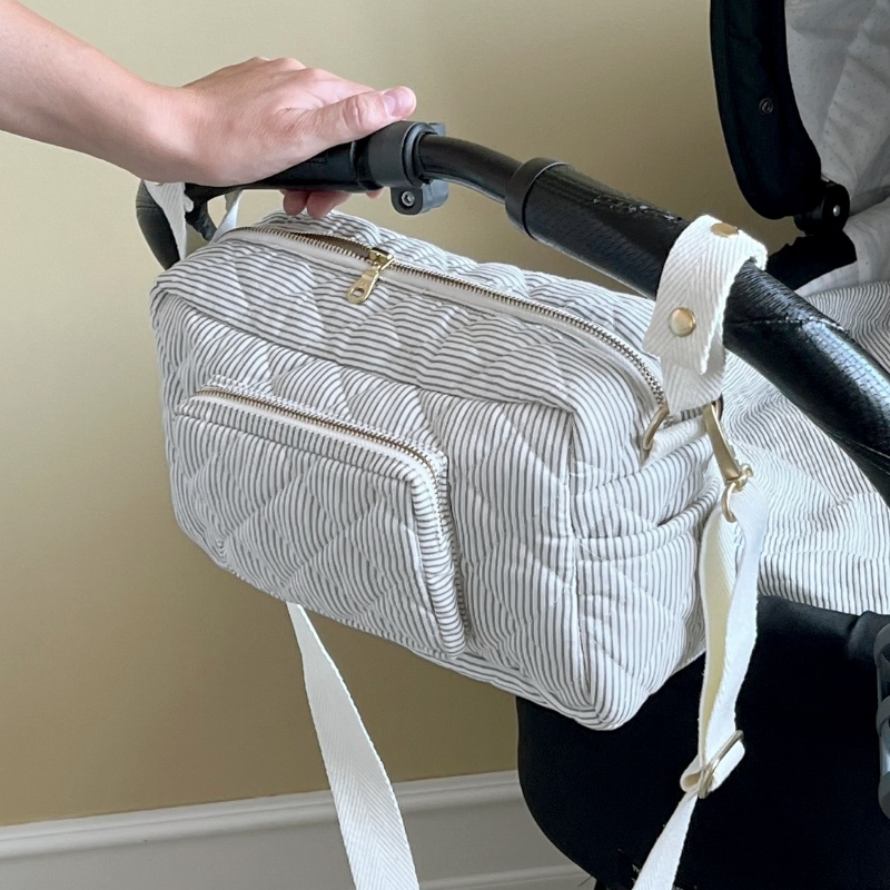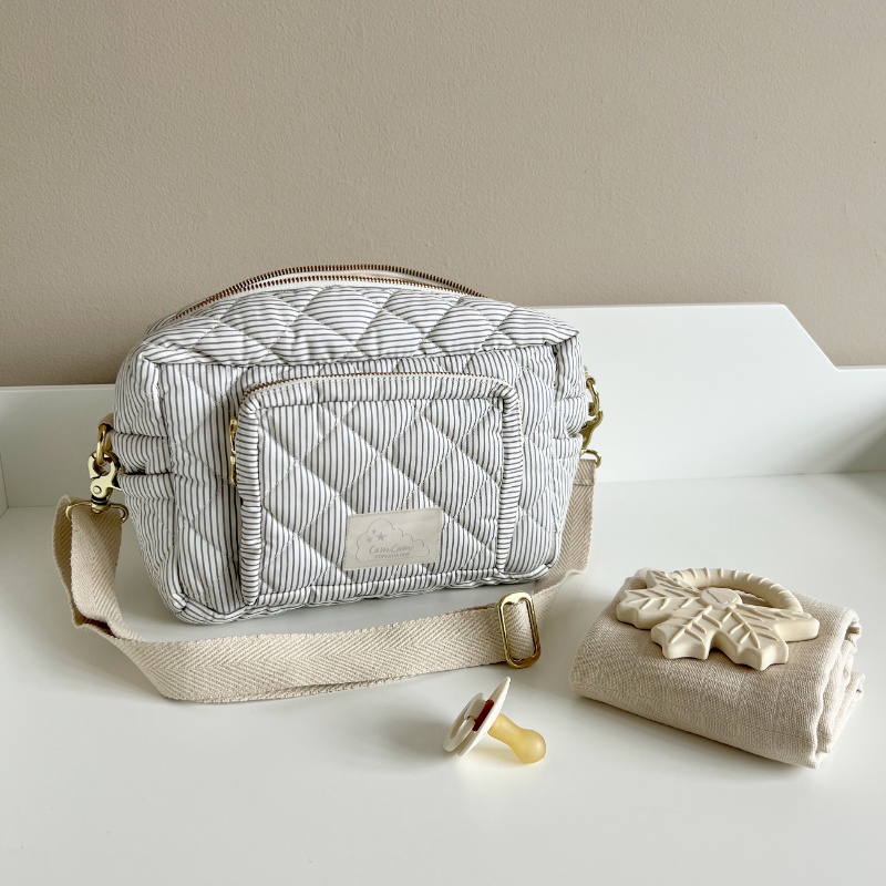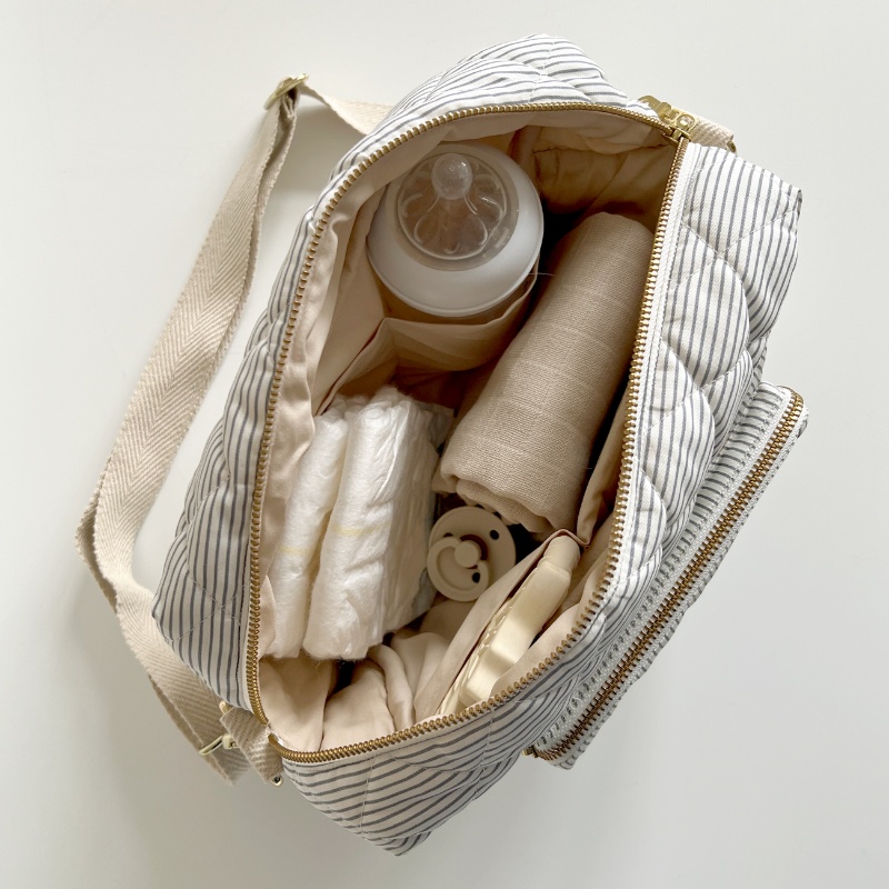 Компактная и удобная сумка создана специально для тех случаев, когда нужно взять с собой только самое необходимое. Несмотря на небольшой размер, внутри найдётся место для подгузников, салфеток, бутылочки и других мелочей. Элегантные голубые полоски придают аксессуару лёгкость и универсальность, позволяя сочетать его с повседневным гардеробом. Плотная ткань держит форму, а регулируемый ремень обеспечивает комфорт в любой ситуации.